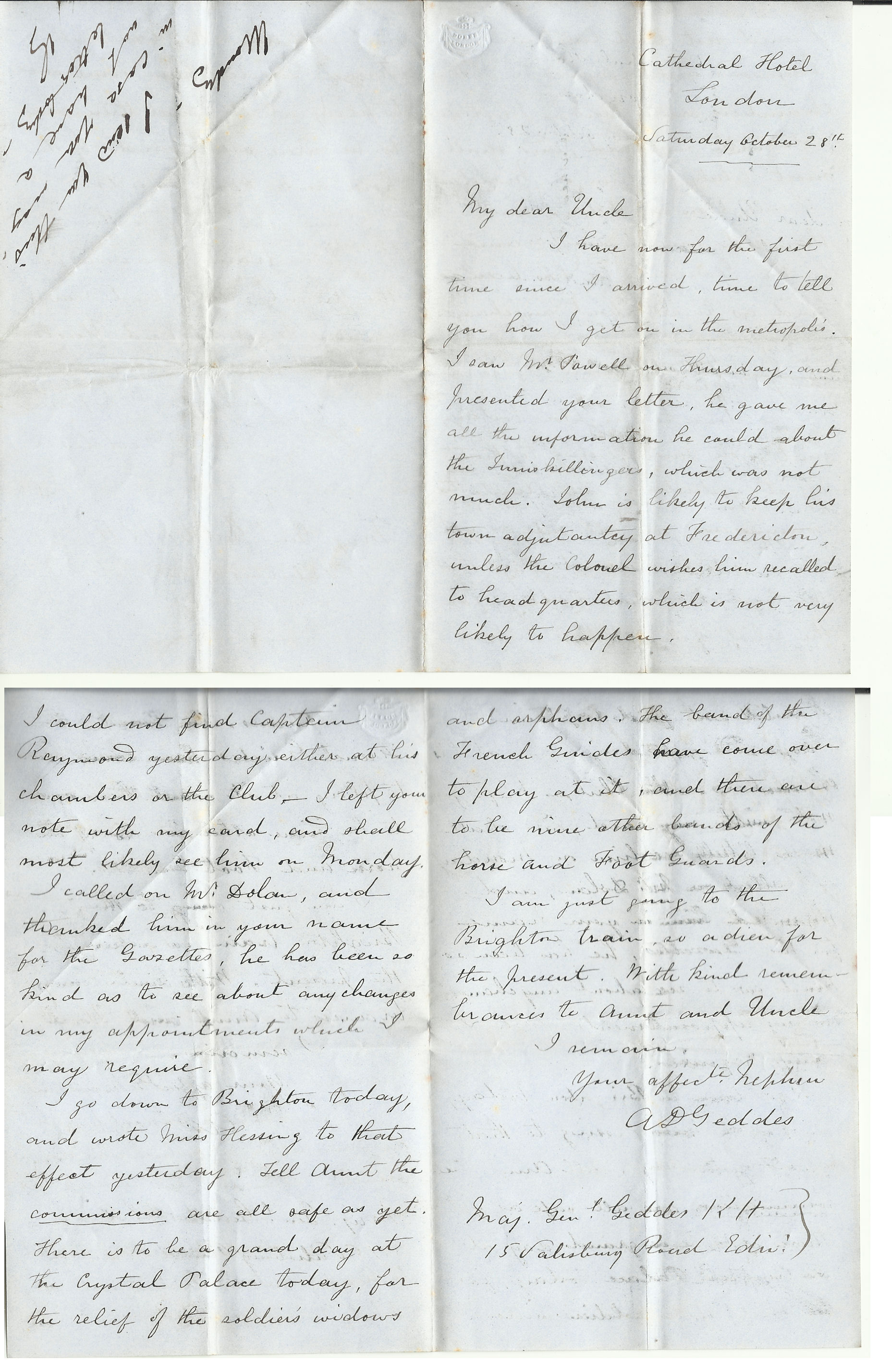 I have now for the first time since I arrived, time to tell you how I get on with the metropolis. I saw Mr. Powell on Thursday and presented your letter. He gave me all the information he could about the Inniskillings, which was not much. John is likely to keep his town adjuctancy at Fredericton, unless the Colonel wishes him recalled to headquarters, which is not likely to happen. I could not find Captin Raymond yesterday either at his chambers or the Club. I left your note with my card and shall most likely see him on Monday. I called on Mr. Dolan and thanked him in your name for the Gazettes, he has been so kind as to see about any changes in my appointments which I may require. I go down to Brighton today and wrote Miss Hessing to that effect yesterday. Tell Aunt the commissions are all safe yet. There is to be a grand day at the Crystal Palace today for the relief of the soldiers' widows and orphans. The band of the French Guards have come over to play at it and there are nine other bands of the Horse and Foot Guards. I am just going to the Brighton train so adieu for the present.