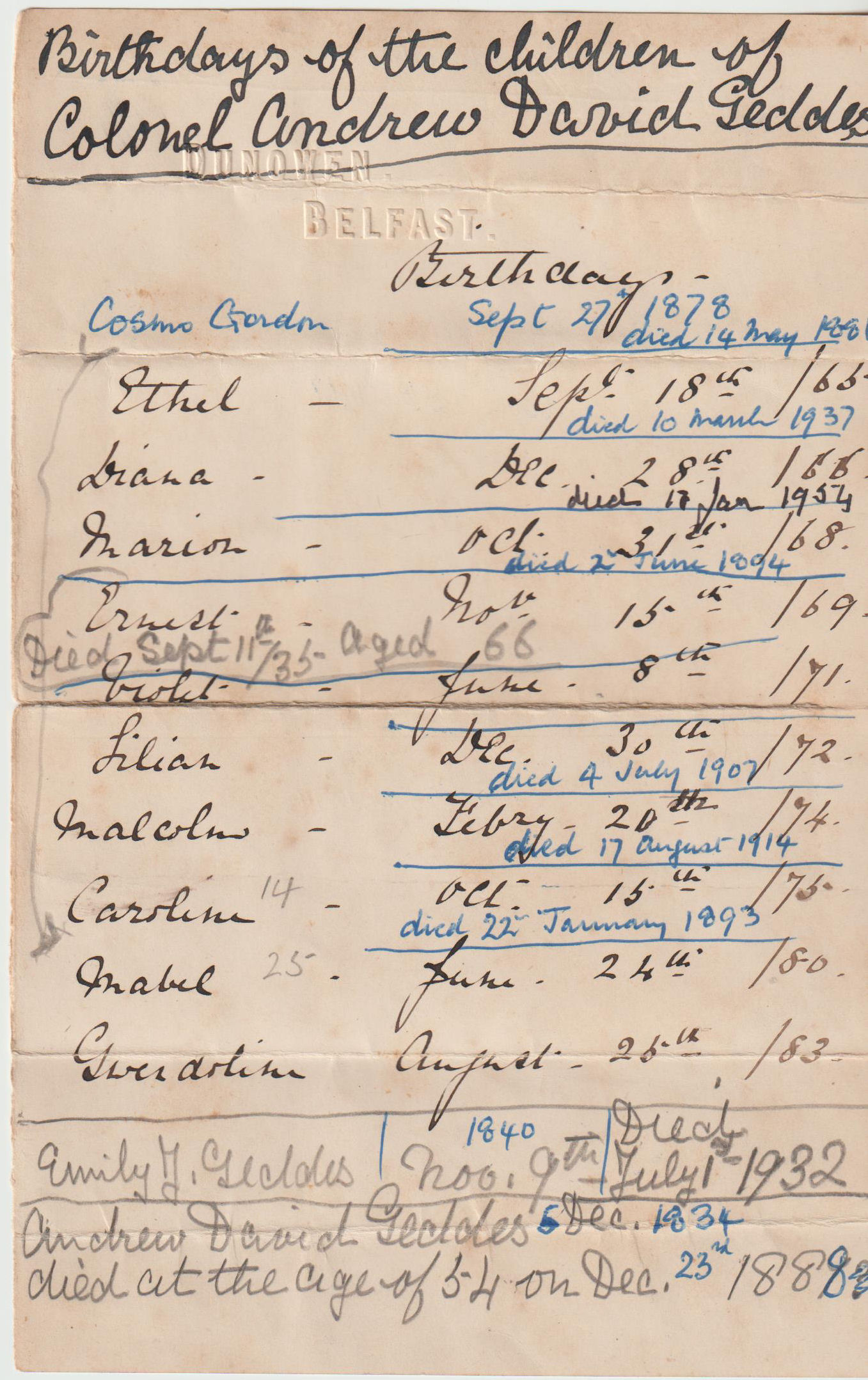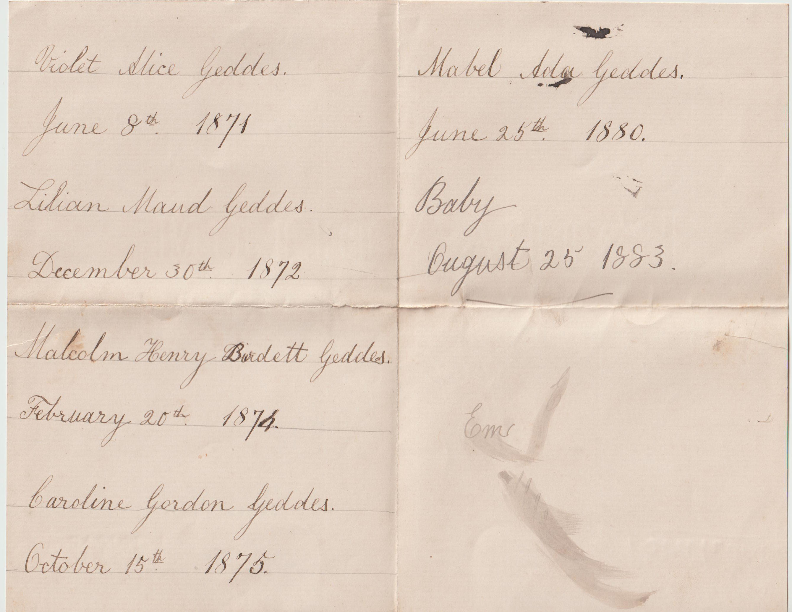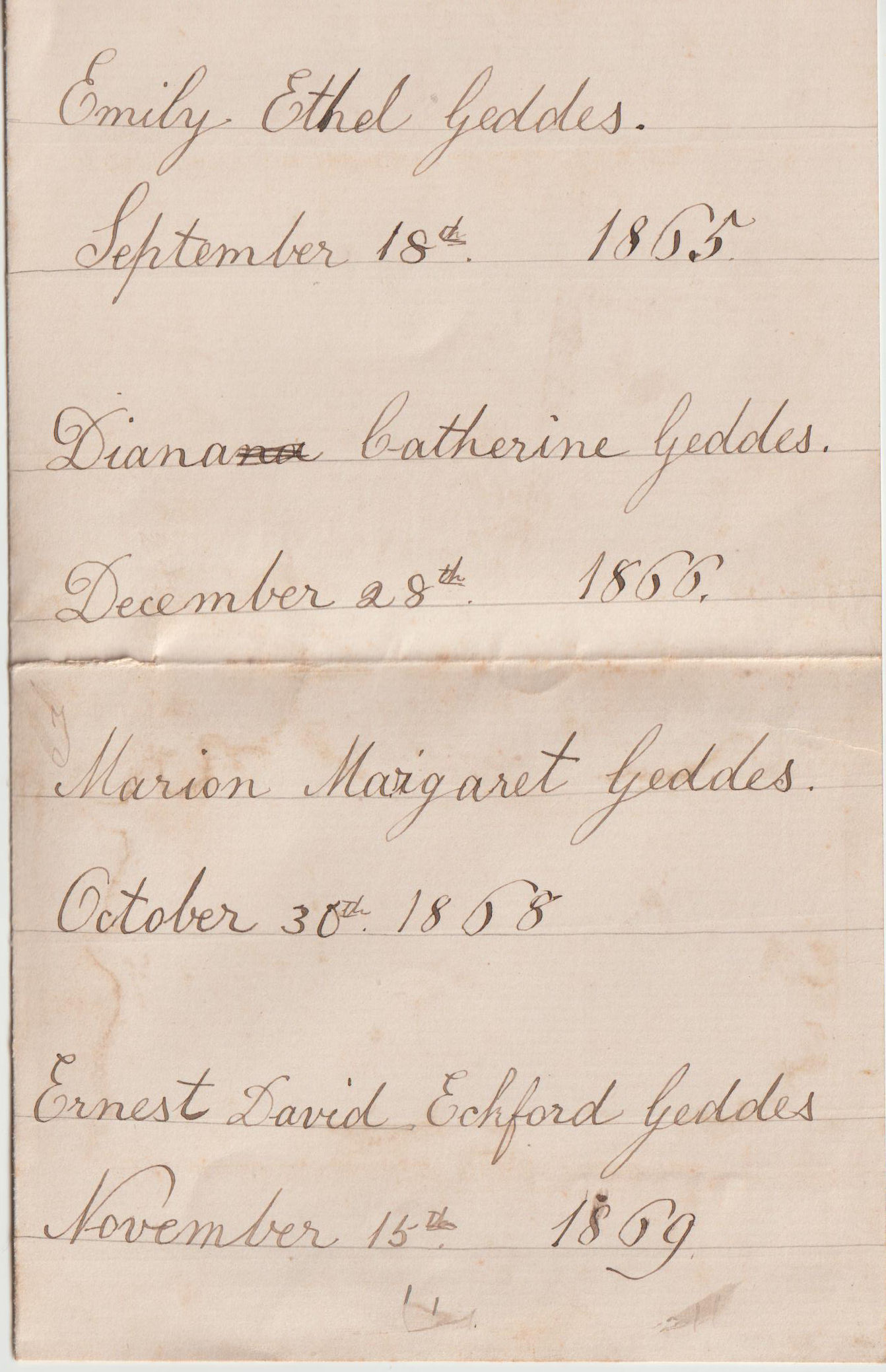 The following gives the grandchildren of Andrew and Emily Geddes. It doesn't give their parents names, but that can be deduced from surnames, or dates. It includes my father John Frederick Dibblee.