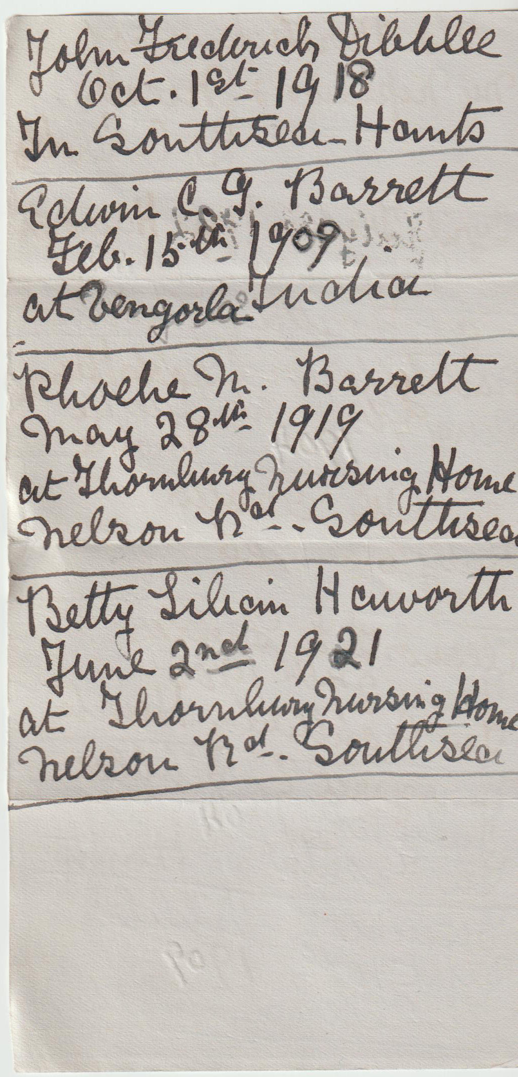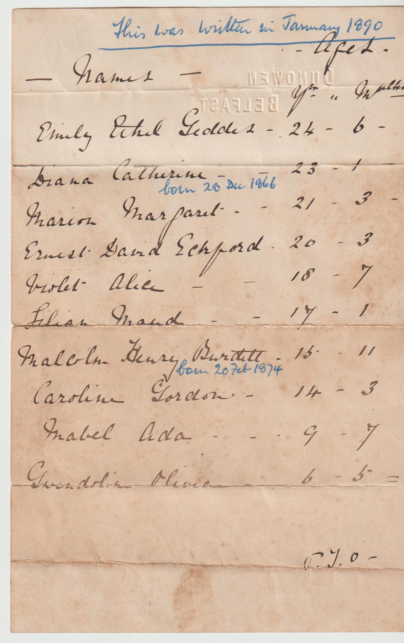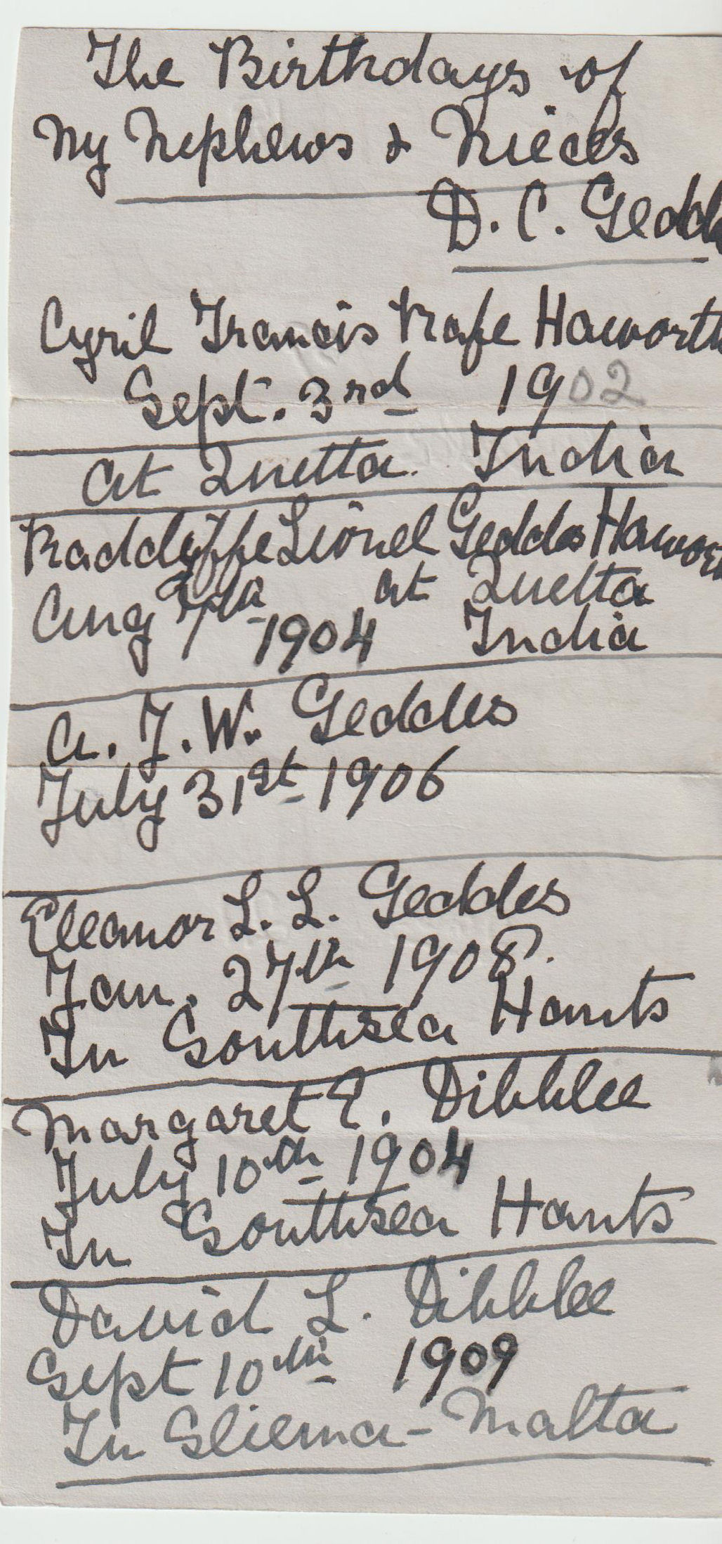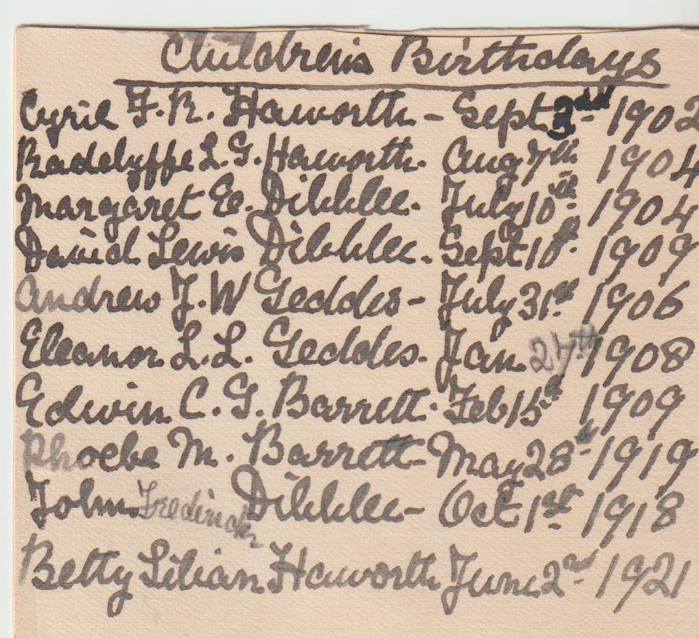 The following gives the grandchildren of Andrew and Emily Geddes. It doesn't give their parents names, but that can be deduced from surnames, or dates. It includes my father John Frederick Dibblee.