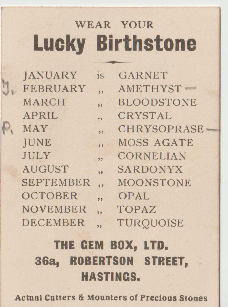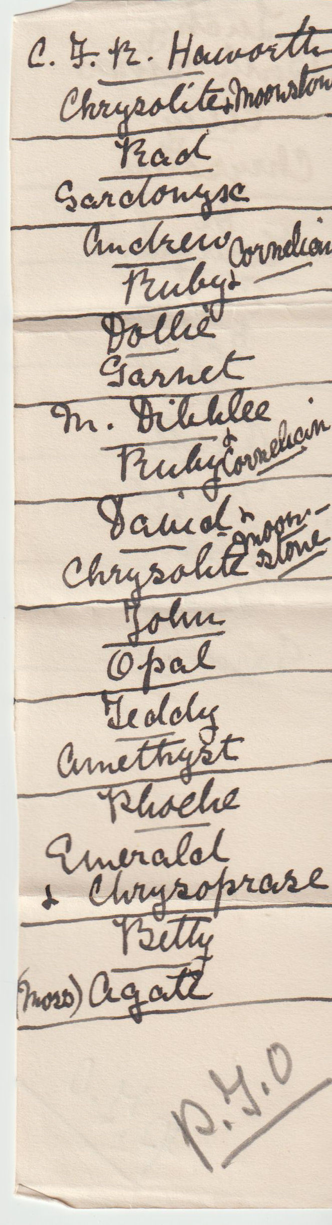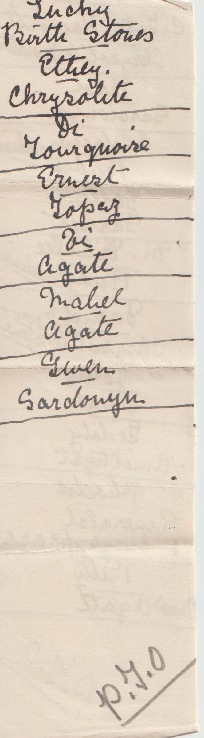 This covers both the children and grandchildren of Andrew and Emily Geddes. I presume that Diana Geddes found the information in a jewellers, and made a note of which stone might be suitable for her relatives. She may have also found another list somewhere, since several have two stones, and "ruby" is mentioned, which isn't on the list. I suspect that this has long been a jewellers selling technique!