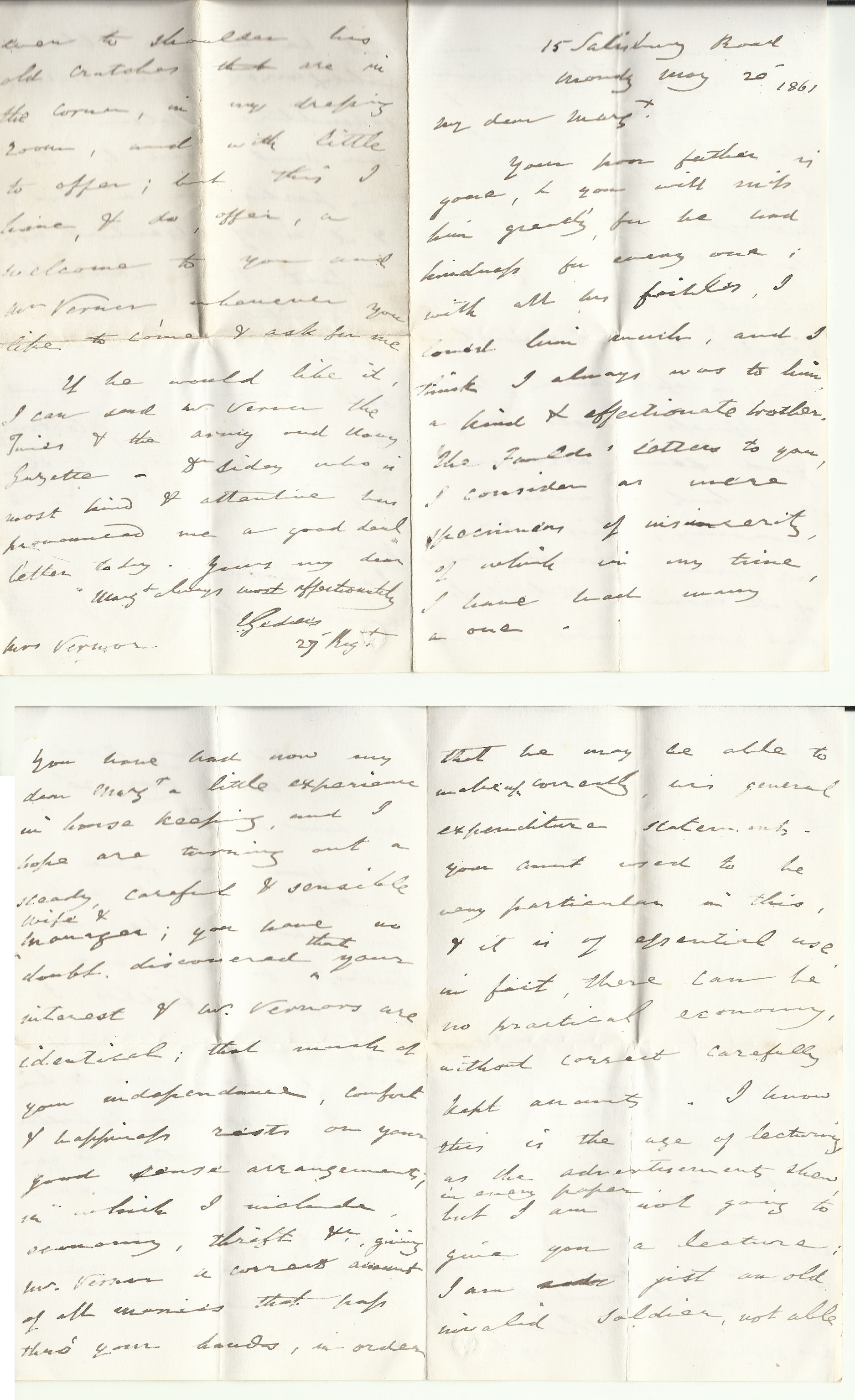 Your poor father is gone, & you will miss him greatly, for he had kindness for every one. With all his foibles, I loved him much, and I think I was always to him a kind and affectionate brother. The Faulds' letters to you, I consider mere specimens of insincerity, of which I have had many a one. You have had now my dear Margt. a little experience in house keeping, and I hope are turning out a steady, careful and sensible wife & manager; you have no doubt discovered that your interest & Mr. Vernor's are identical; that much of your independence, comfort & happiness rests on your good house arrangements, in which I include economy, thrift, etc. giving Mr. Vernor a correct account of all monies that pass through your hands in order that he may be able to make up correctly his general expenditure statements. Your auntused to be very particular in this & it is of essential use, in fact there can be no practical economy without correct carefully kept accounts. I know this is the age of lecturing, as the advertisements show in every paper, but I am not going to give you a lecture. I am just an old invalid soldier, not able even to shoulder his old crutches that are in the corner in my dressing room, and with little to offer; but this I do offer, a welcome to you and Mr. Vernor whenever you like to come and ask for it. If he would like it, I can send to Mr. Vernor the Times & the Army and Navy Gazette. Dr. (?)Sidey who is most kind & attentive has pronouced me a good deal better today.