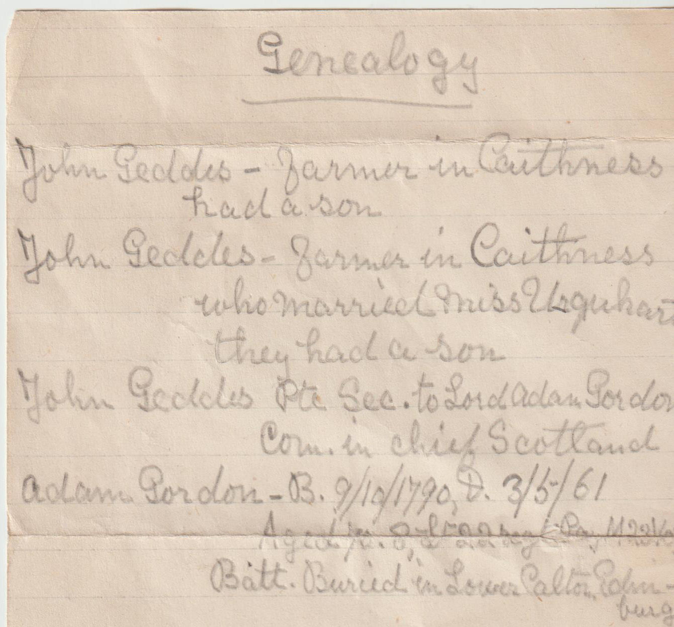 My parents' research didn't really go back further than John Geddes (III). There was a family tradition that his father and grandfather were both called John Geddes, hence the numbering. However, Bob King has been doing some research using Scotland's People, and discovered that John Geddes II doesn't exist. He has found the following information: