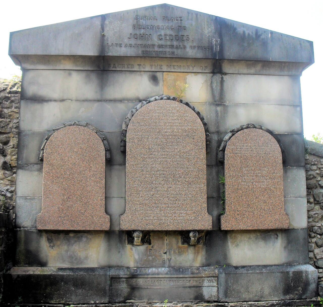 I am grateful to the Gravestone Photographic Resource who provided the photo and information below. The copyright belongs to a Gravestone Photographic Resource volunteer. No further use may be made of either without their permission. I have added some of my own comments at the end.All the legible names shown on the John Geddes grave monument (GPR grave number 163020 - image name 10919):