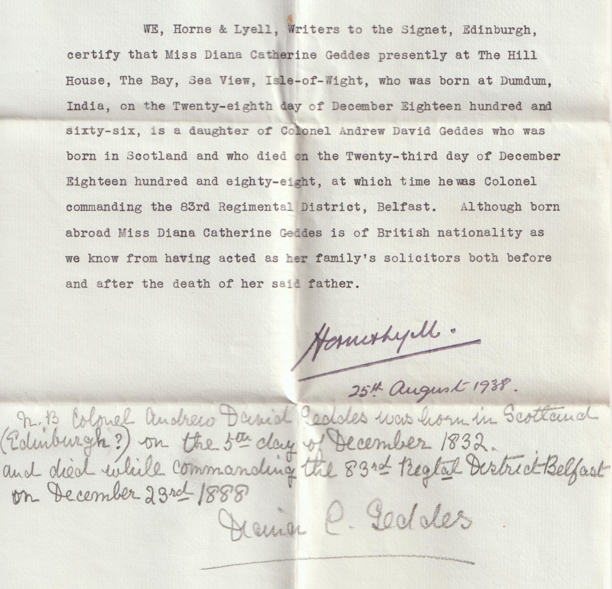 This is a letter from the Geddes solicitor maintaing that Diana Geddes was a British national, despite being born abroad.