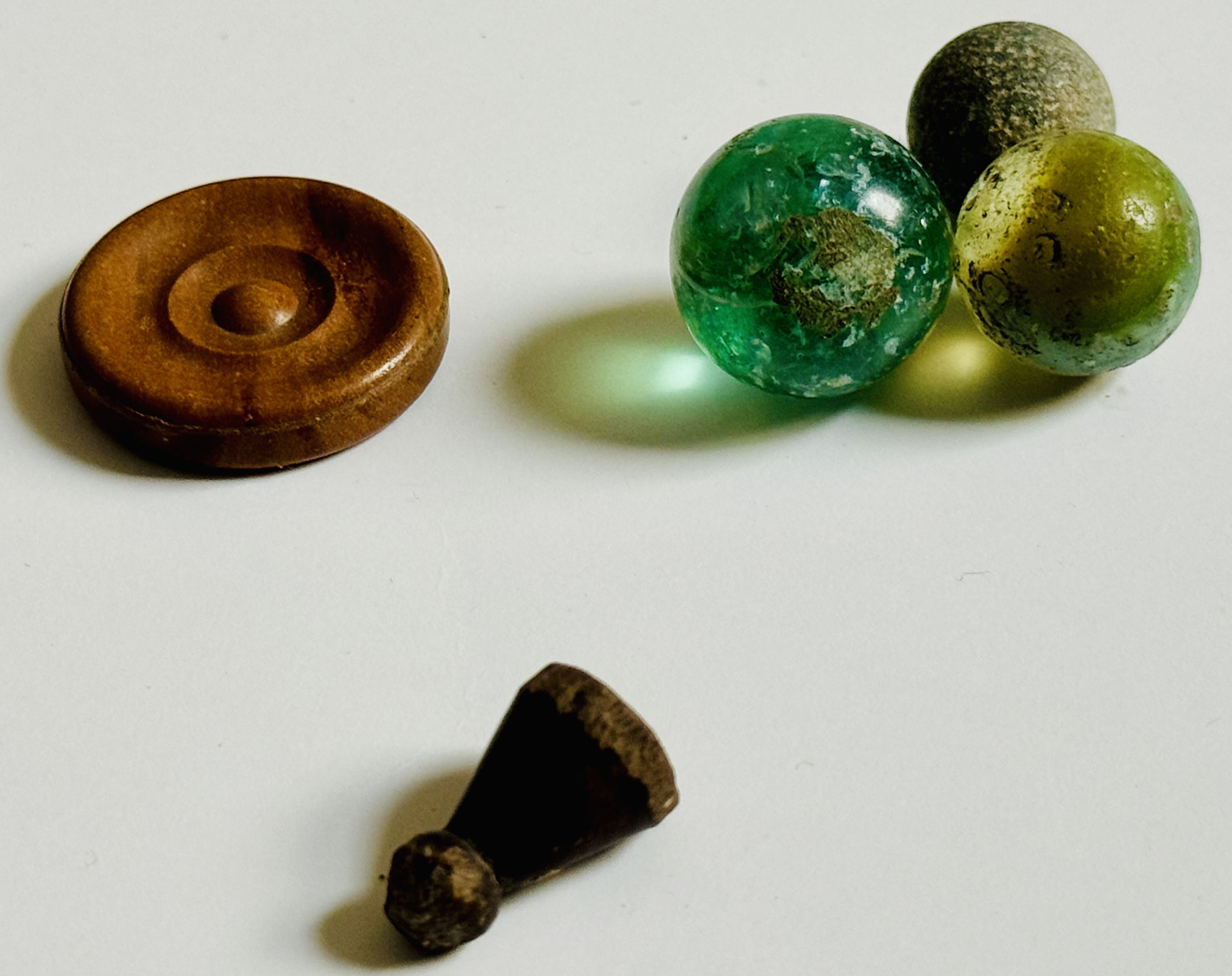 Round objects: The clay balls are probably marbles. The glass balls may be the stopper inside a bottle of fizzy pop.