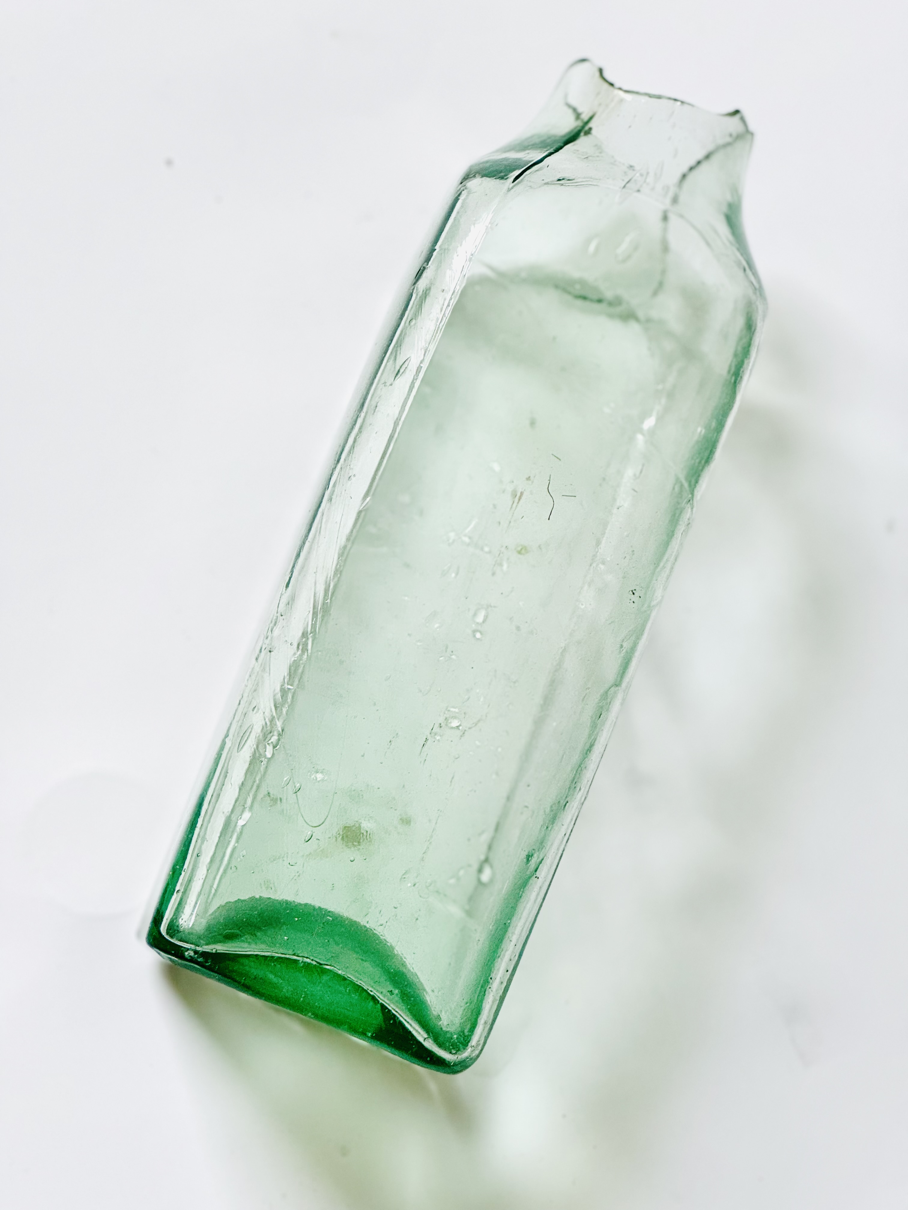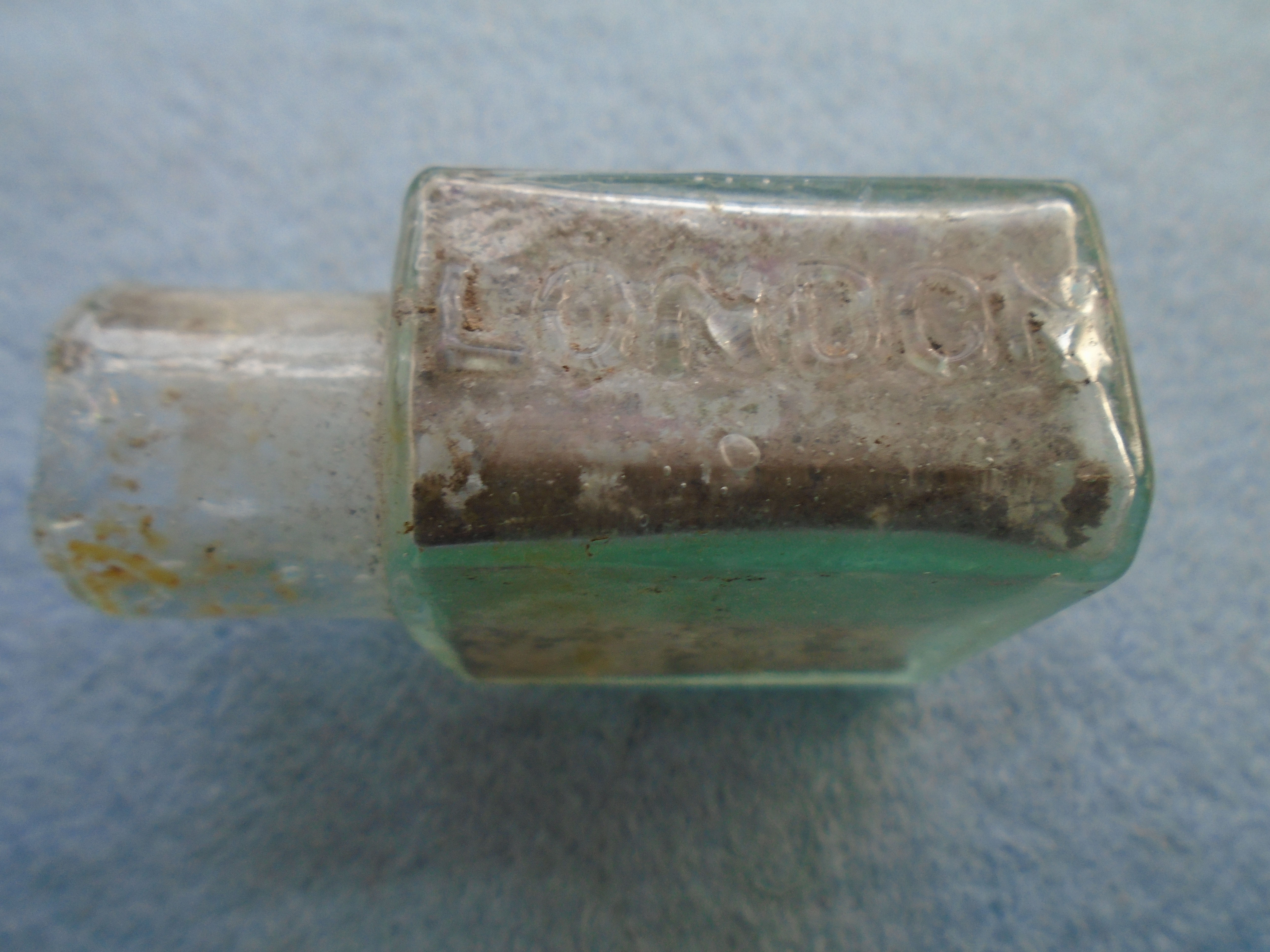 This little bottle used to hold ink. It says Judson on one side, and London on the other. The name "Judson" has the N the wrong way round. Perhaps a mistake in the mould, or even a fake?