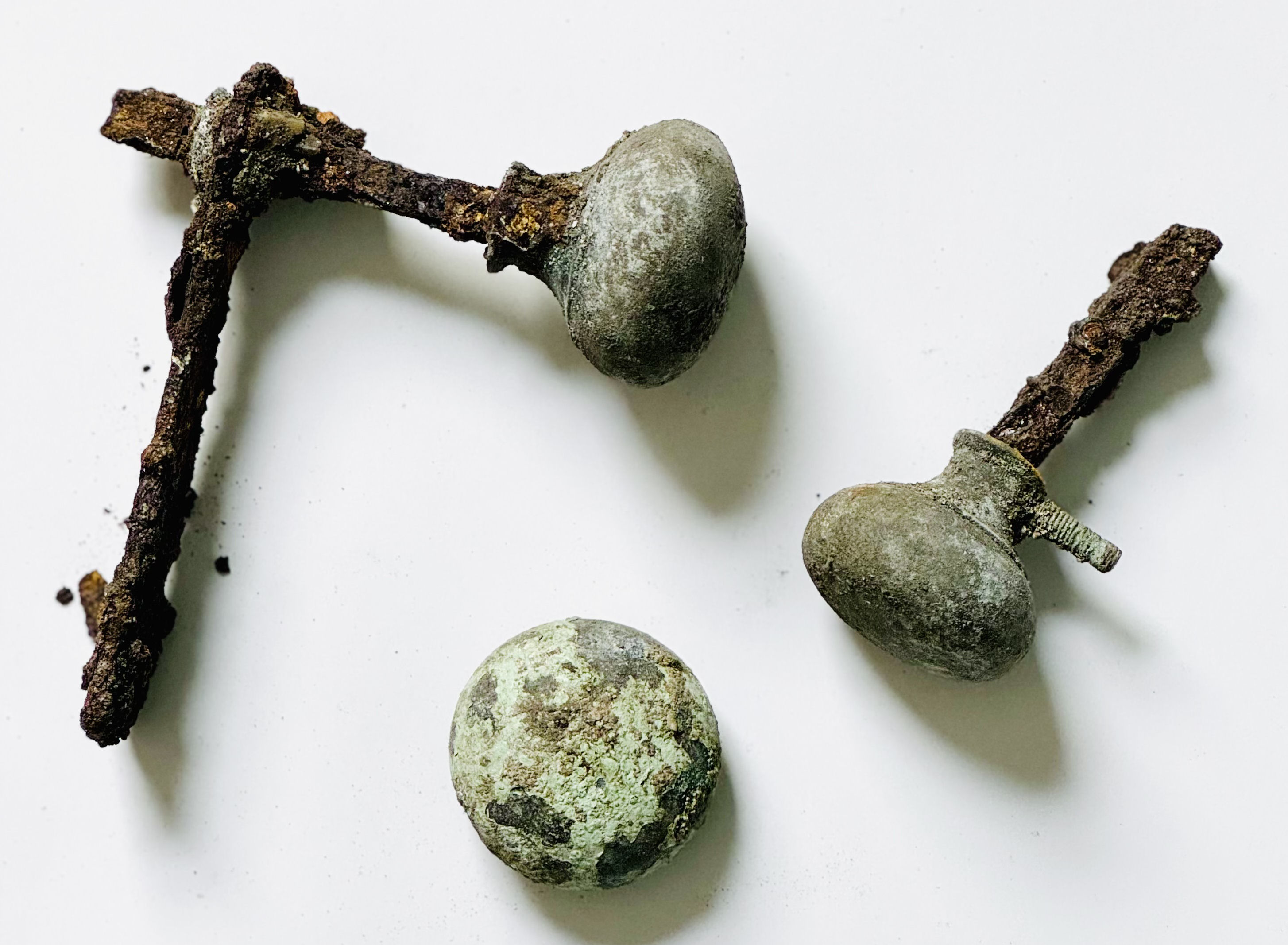 Metal bits. Two are GPO buttons (see Found in shed). One is, I suspect, a fly button or an underwear button! The last seems to be a stud of some kind. The photos below show both sides of each.