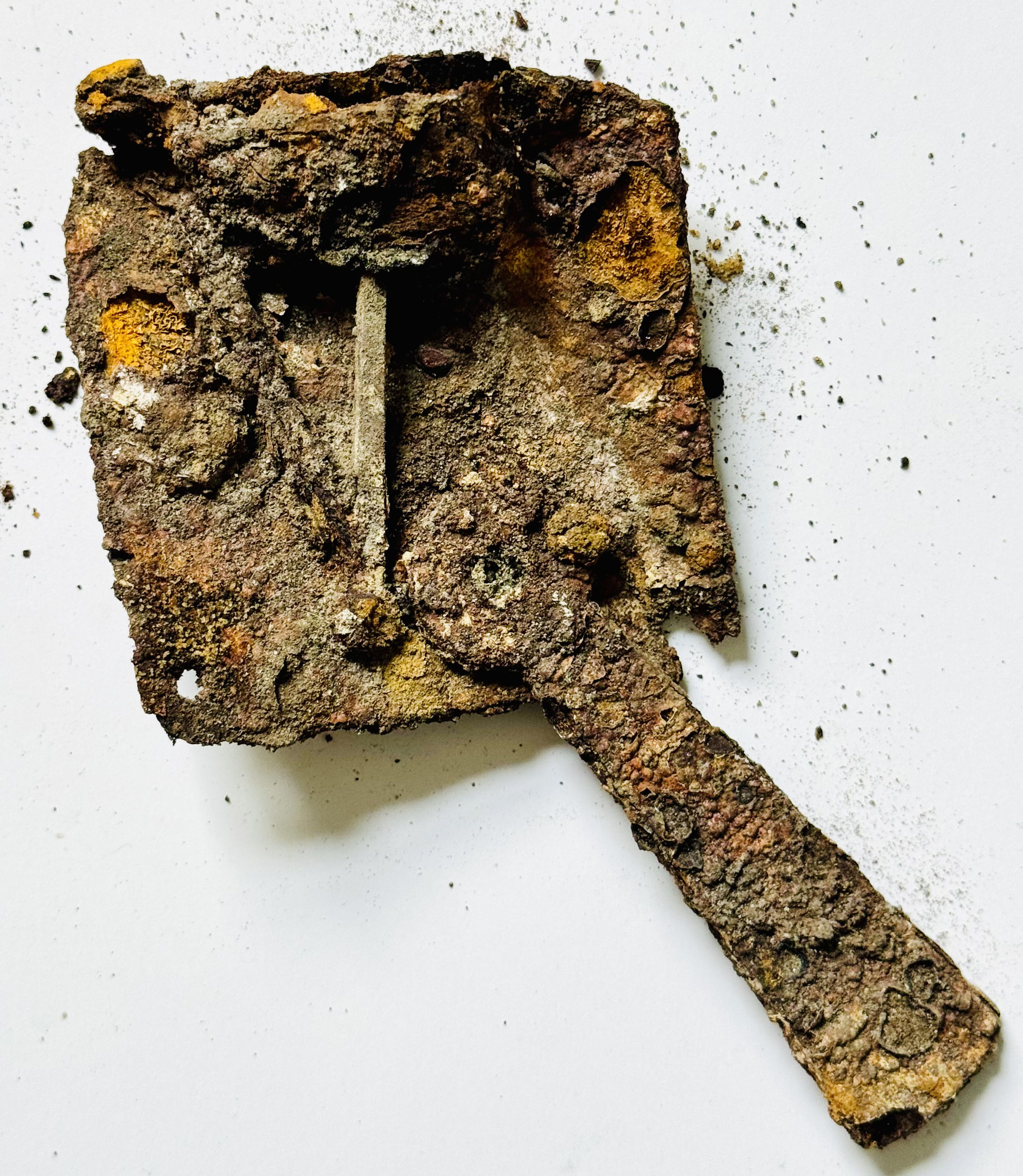 This is an unknown item of brass. I have polished it. The obvious suggestion is that it is a drawer handle, but the screw goes up too far - you wouldn't be able to get your fingers round it! Perhaps just a decoration. Yes, it does look like the Bronze Flower Path on the pavement up Castle Hill, but that dates to 2002, and I can guarantee that this is (a lot) older!