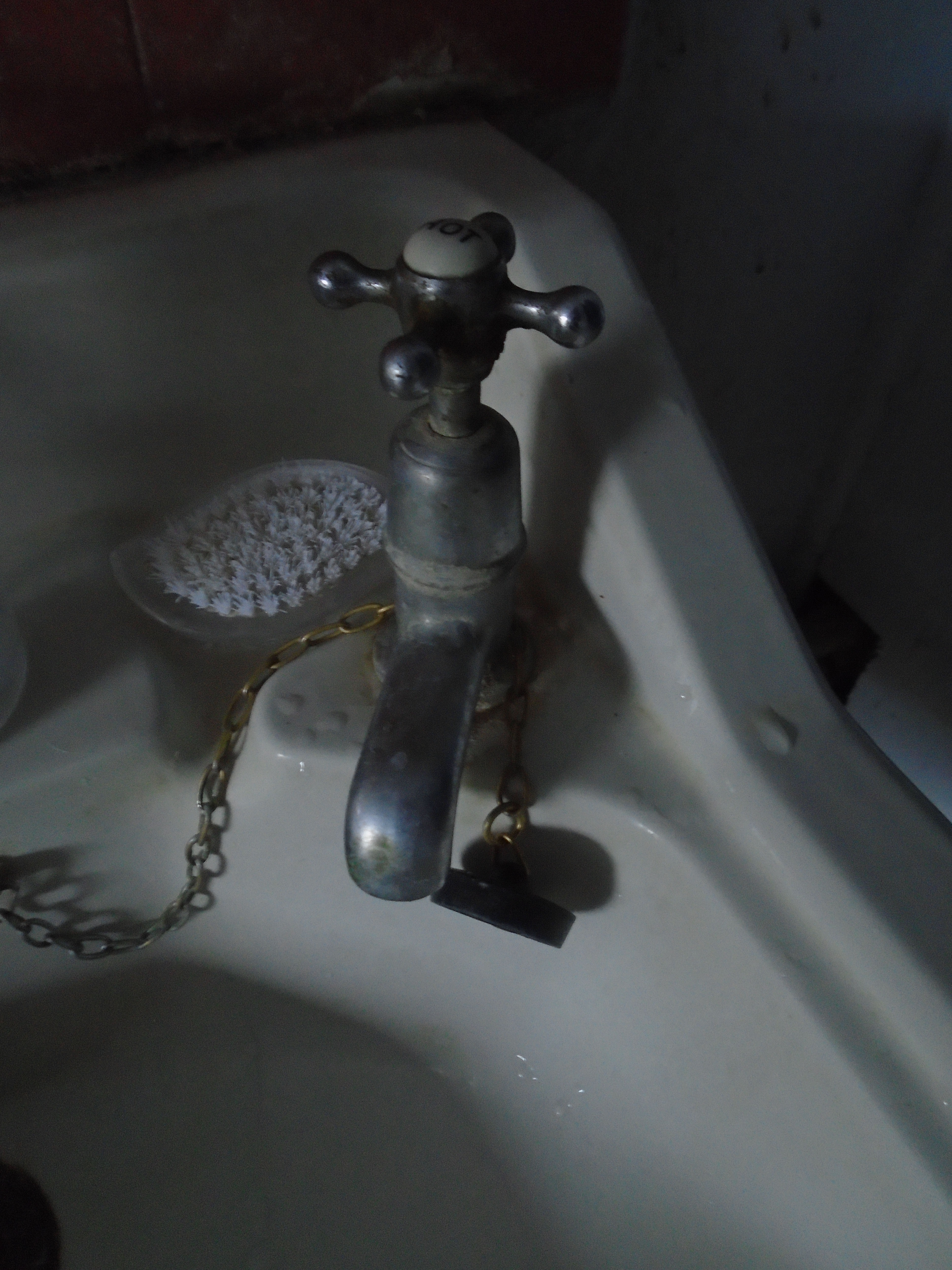 We moved into our house in 1979 and somehow never got round to replacing the bathroom fittings. The bath taps (and the maze) are recent, but the bath, sink, and sink taps are original (although I don't know how old they are). But we did paint the outside of the bath, to high-light the splendid legs!