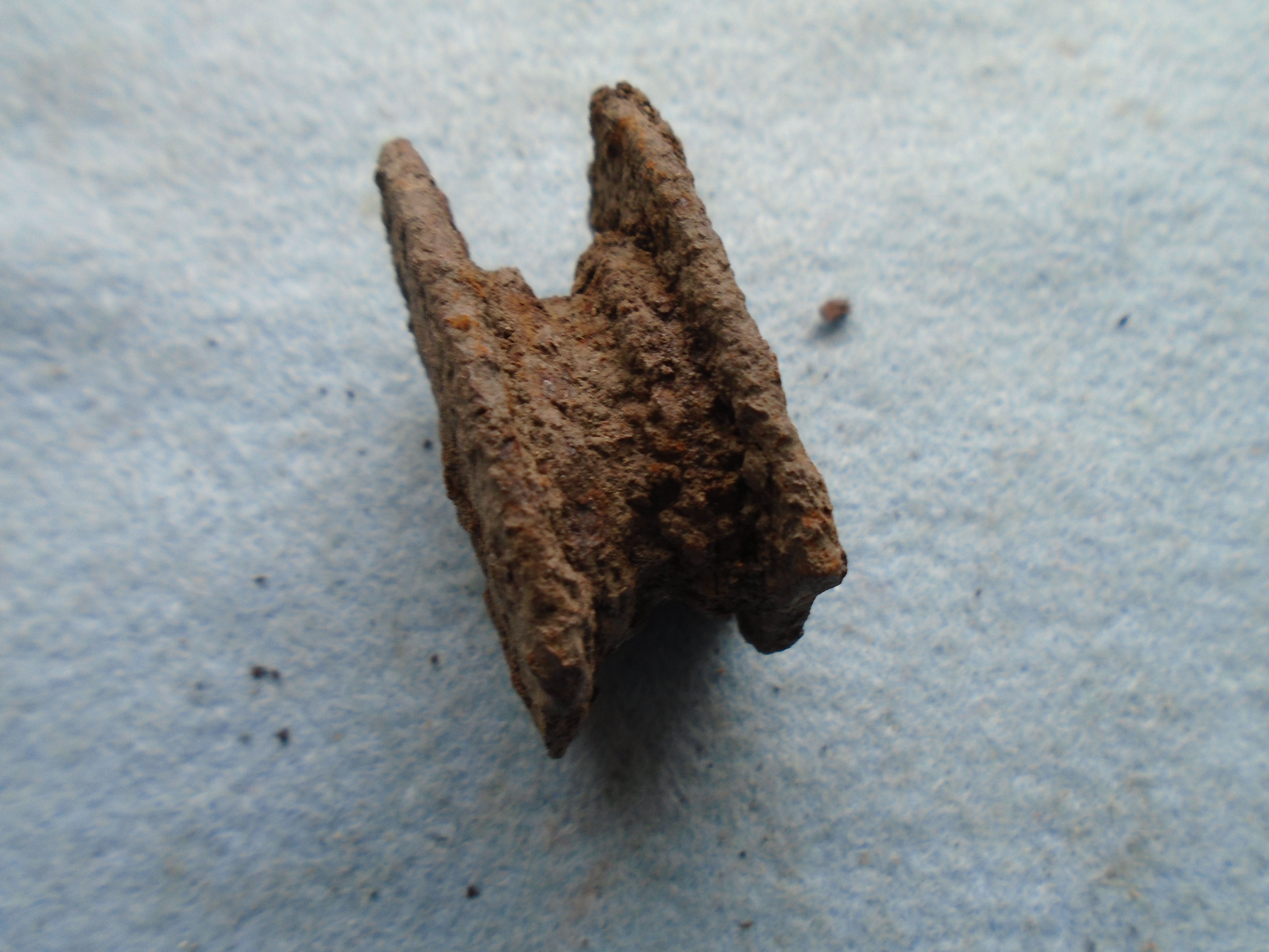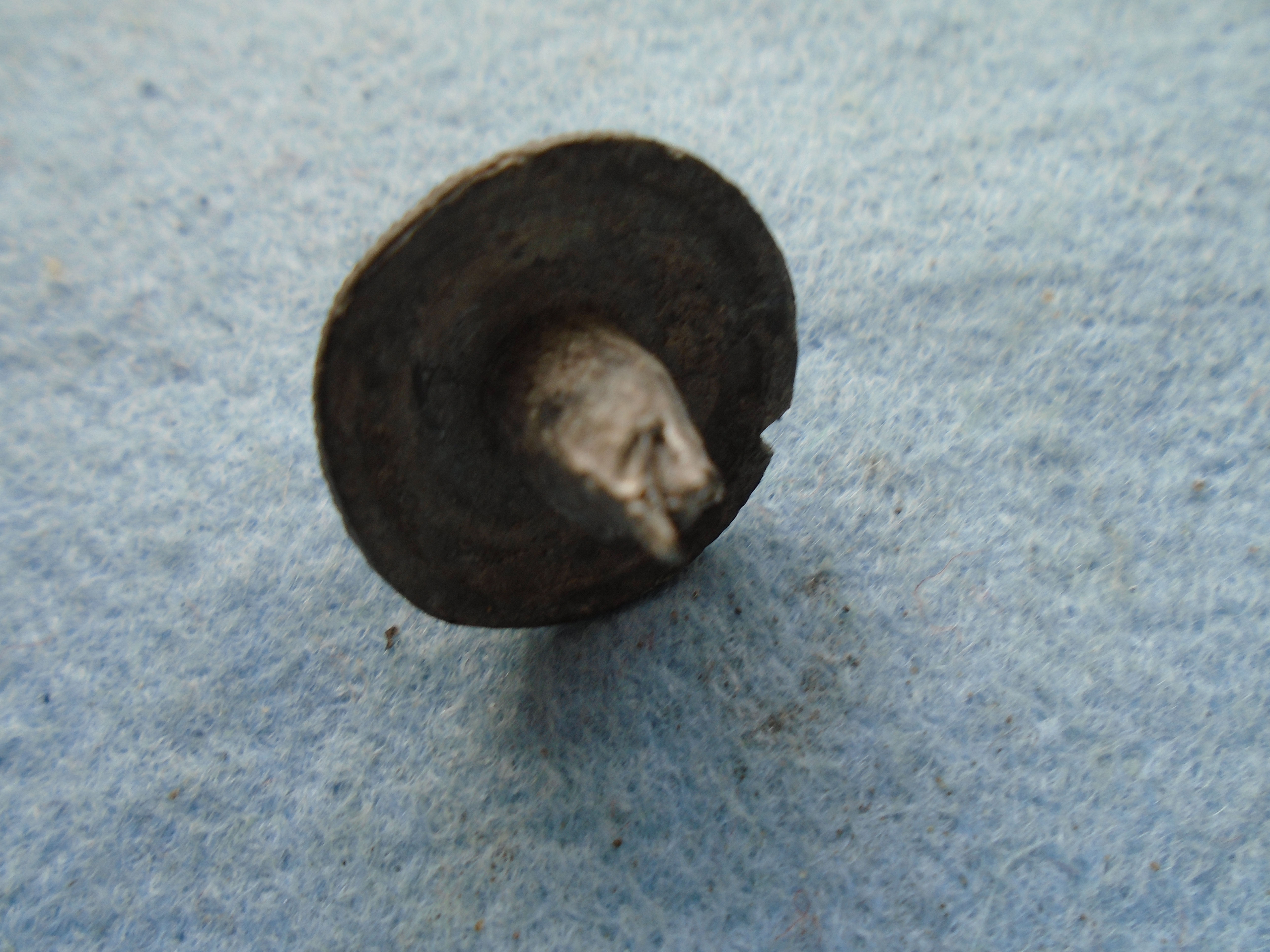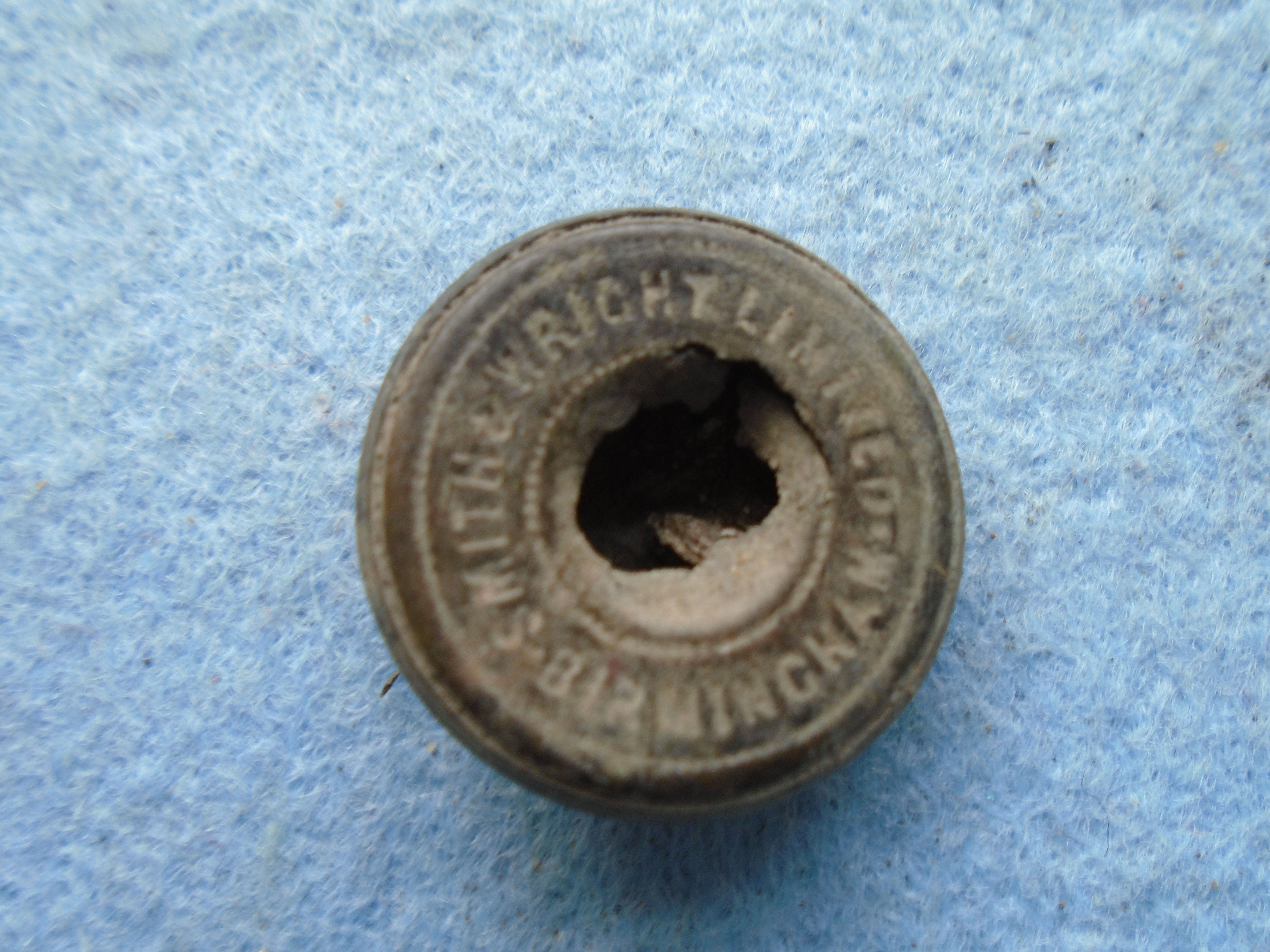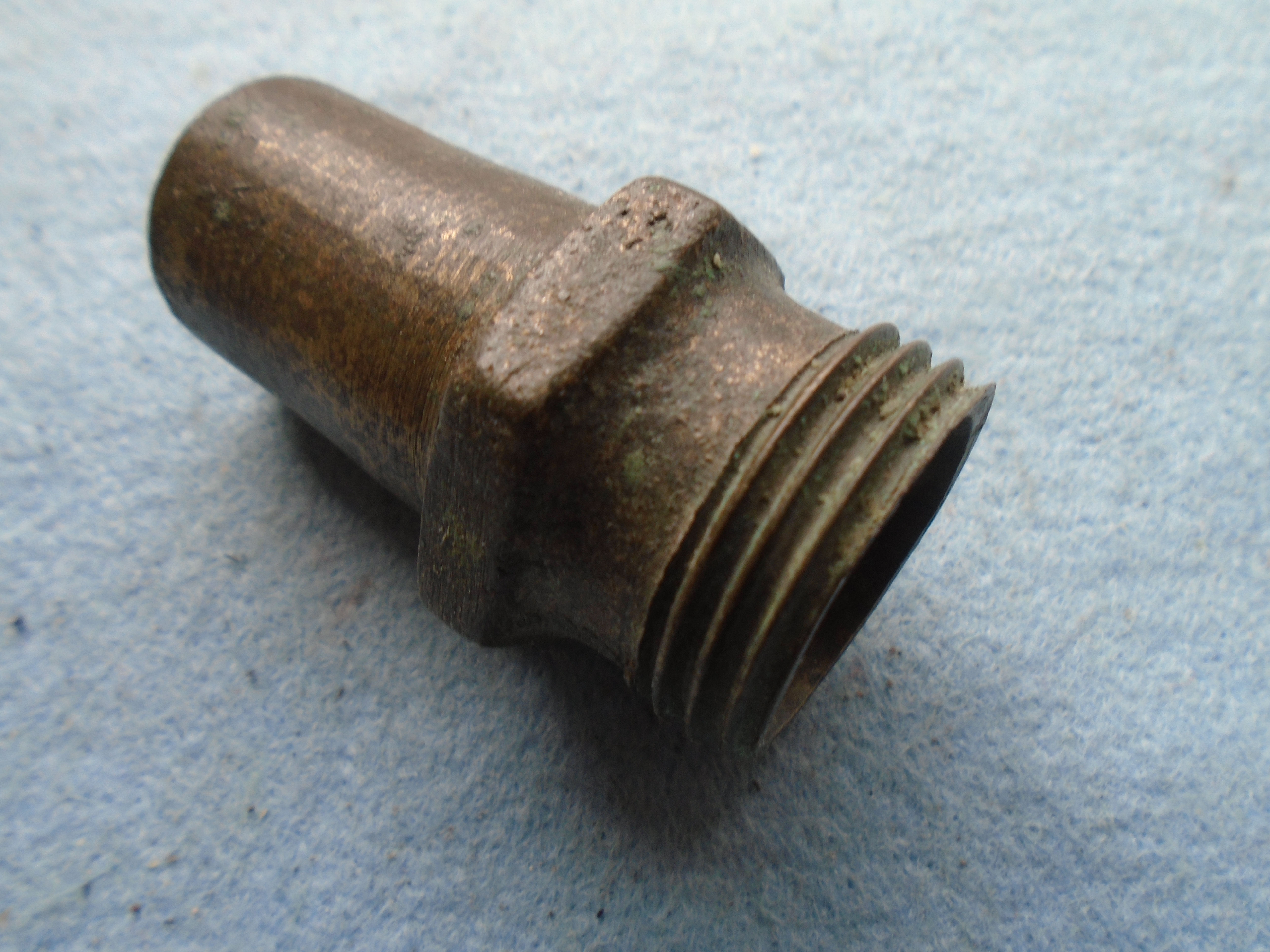 This is a bit worrying - a (fired) bullet! We're in a built-up area, you know... The dimensions suggest that it's a .303 rifle cartridge. These were used by the British Army from 1889 right through to the 1950s. They fitted the Lee-Enfield rifle (which had a similar service life), the Bren machine gun, and Spitfires up to about 1943. One suggestion was that it was a blank cartridge. I hope so! Perhaps some boy found it and kept it as a souvenir. There was a rifle range on Coldhams Common. Or perhaps someone brought it back as a war souvenir.