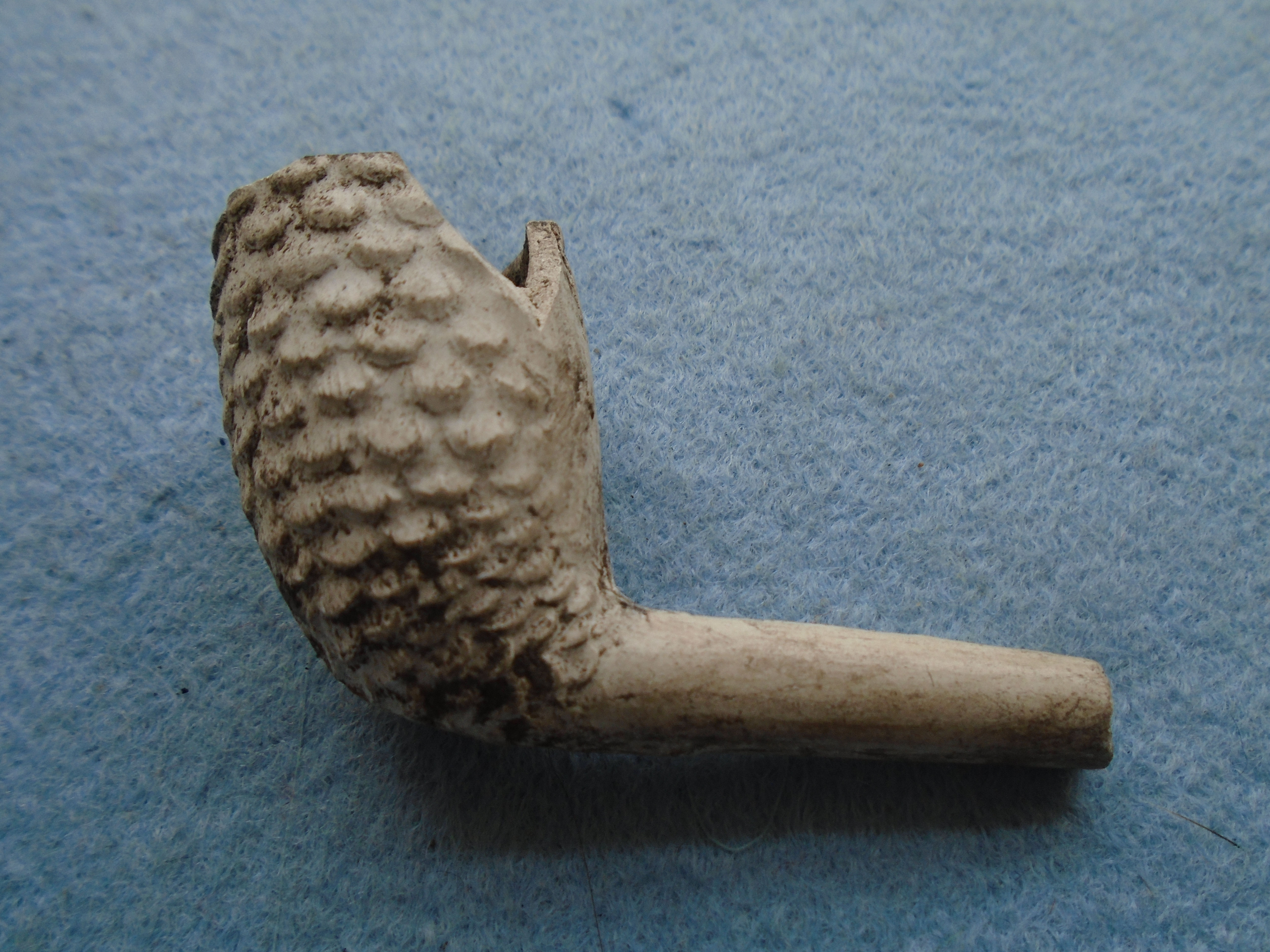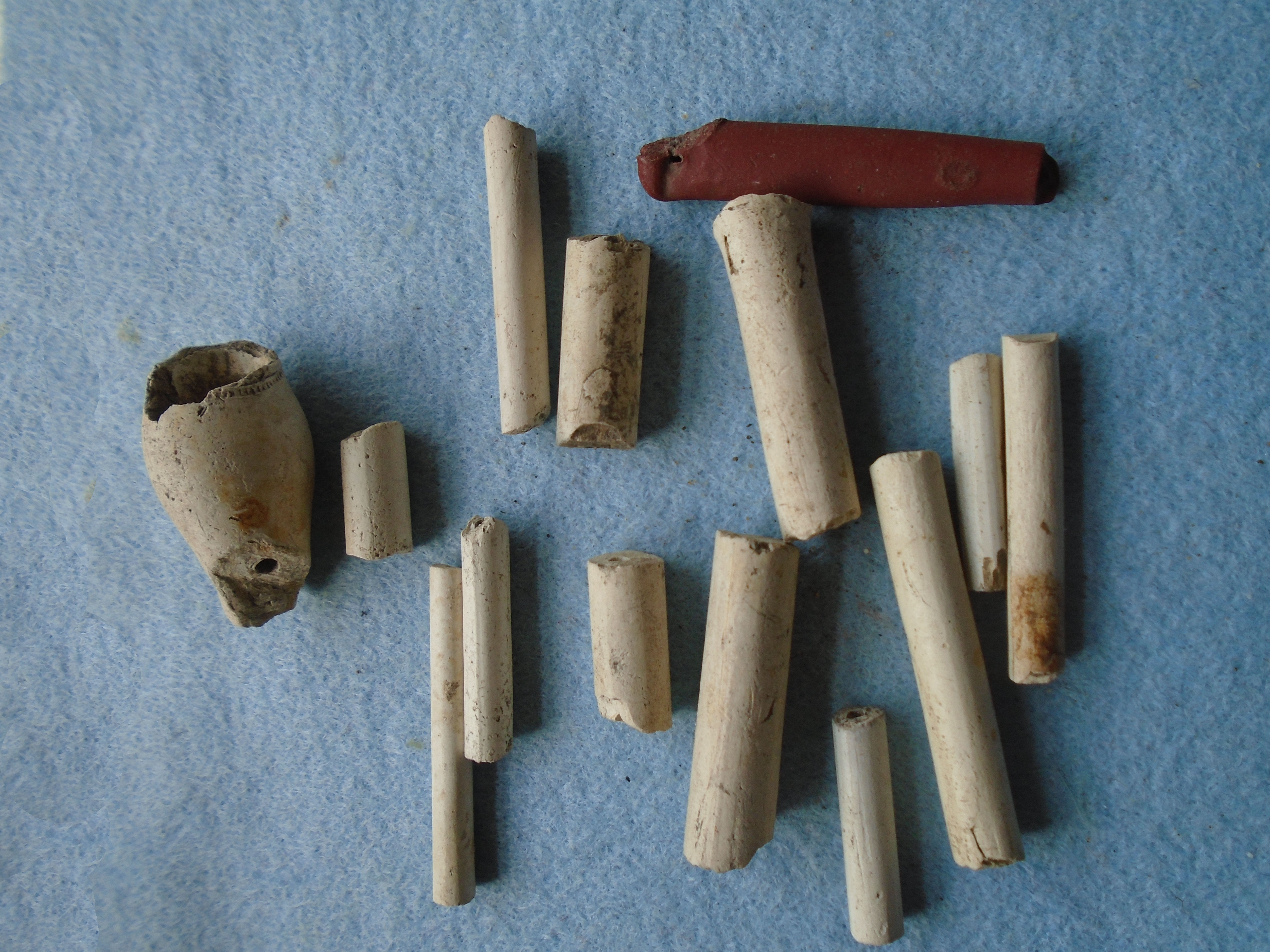 Tobacco was smoked in clay pipes. These had long stems, and were very breakable! So bits of pipe stem are quite common. Sometimes you find the bowl. The stem varied in width within a single pipe.