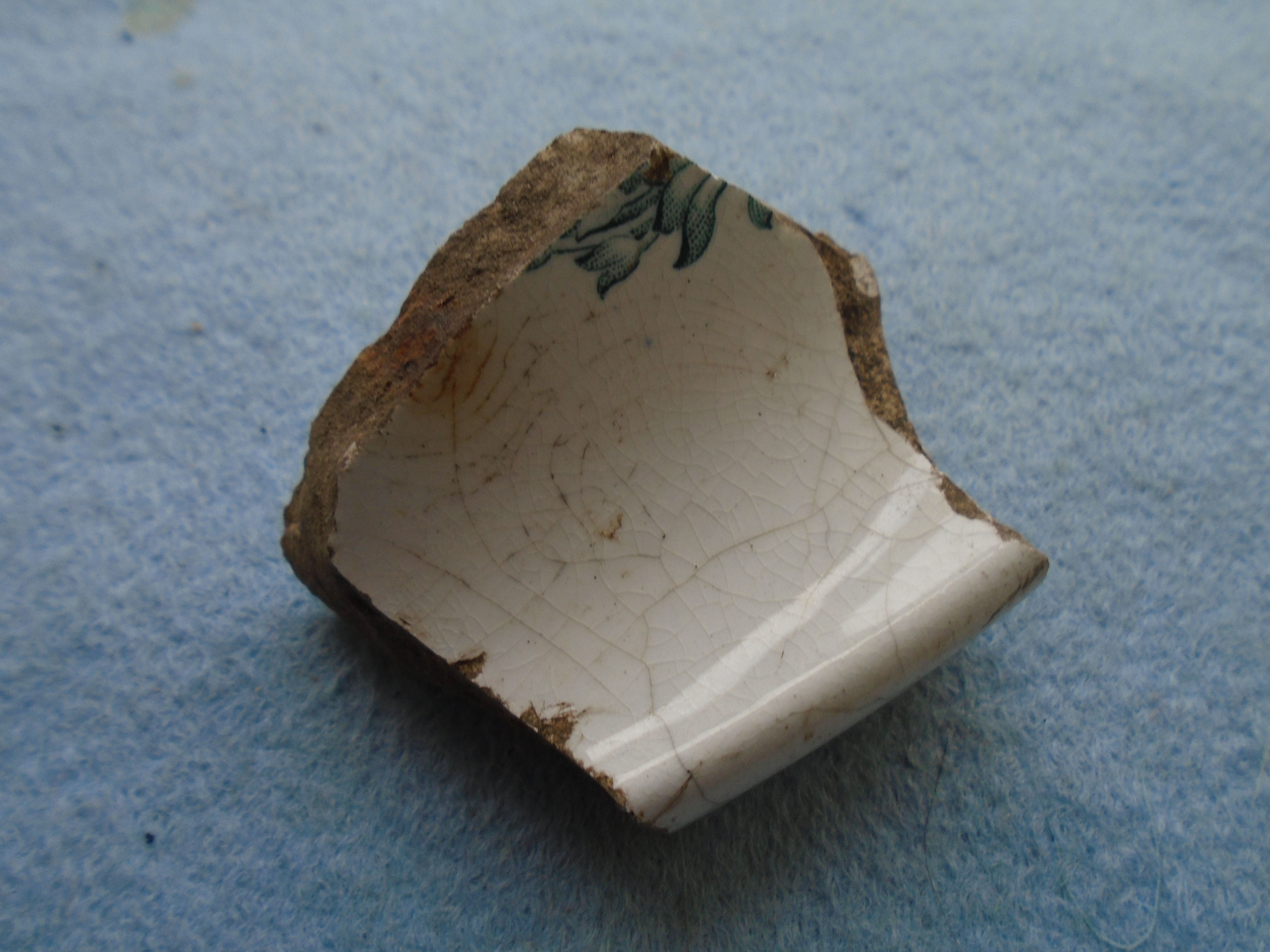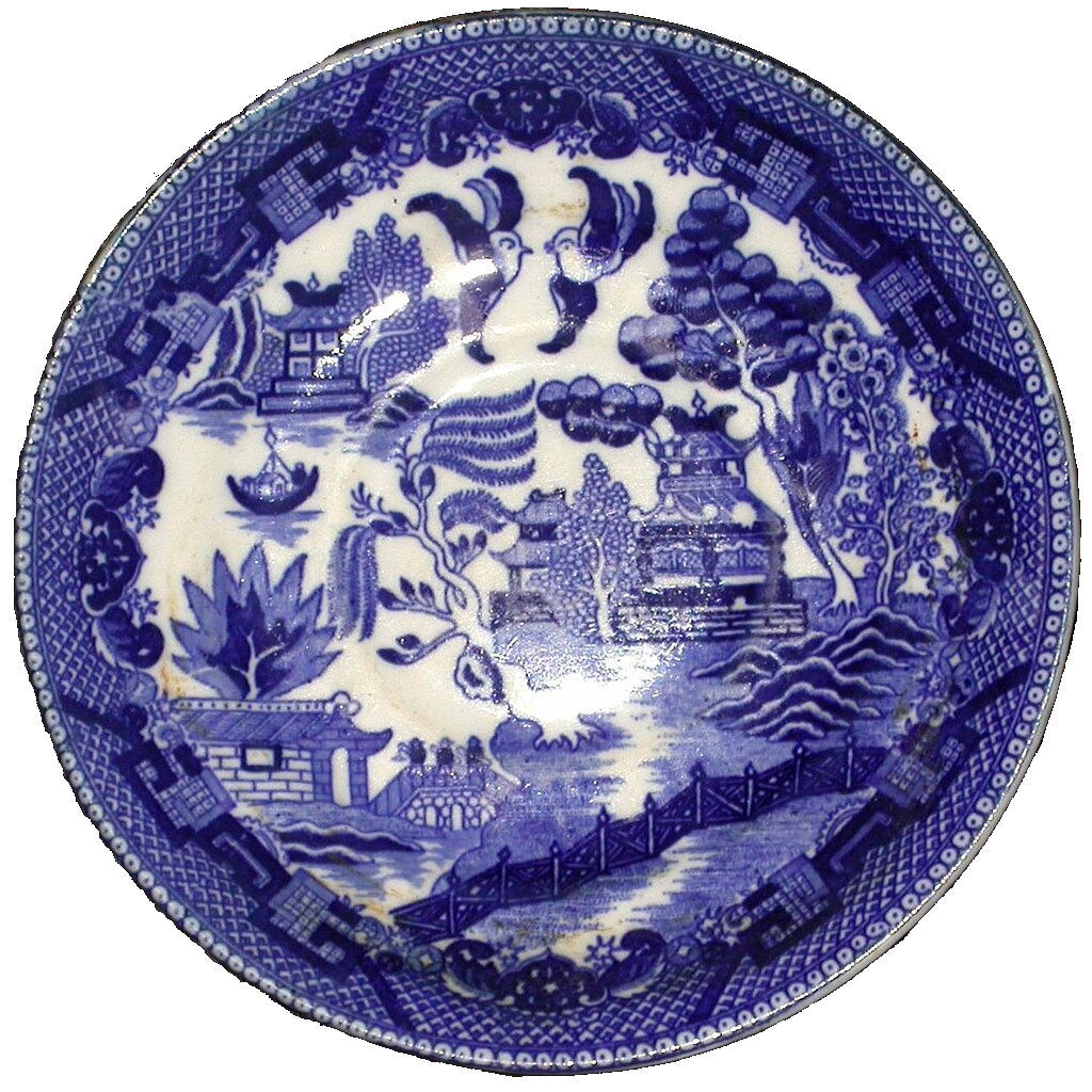 Blue and white ware, like willow pattern, were popular. the picture of the complete plate was taken from the internet. Some of the pieces fit.