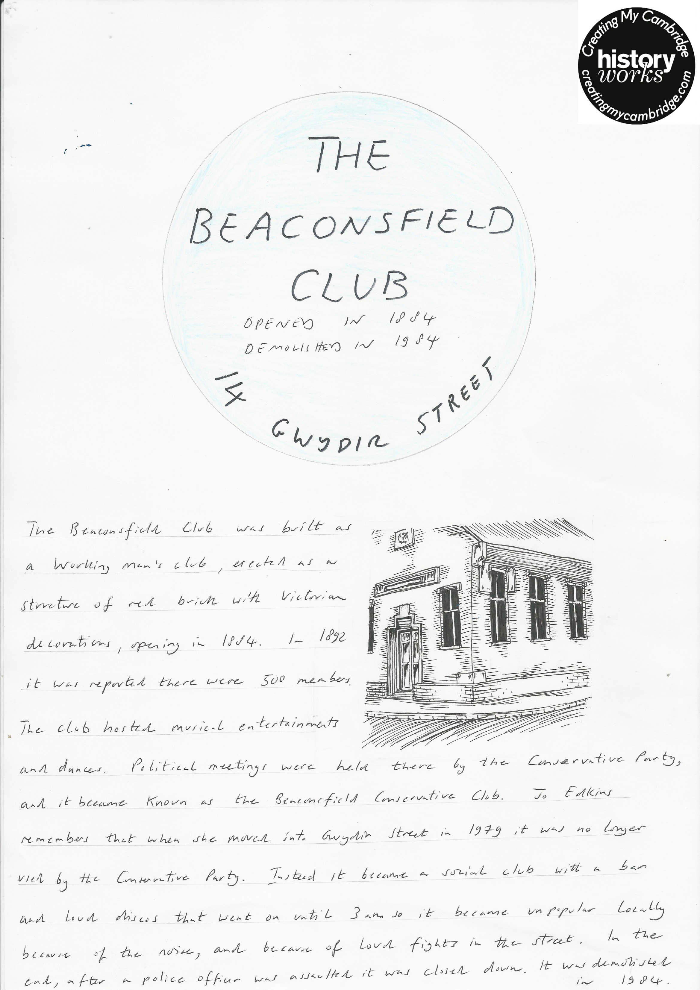 One directory says "The Beaconsfield Club, Gwydir Street, is a structure of brick, erected in 1884 by a limited liability company, as a working man's club : there are now (1892) 500 members : political meetings are also held here."