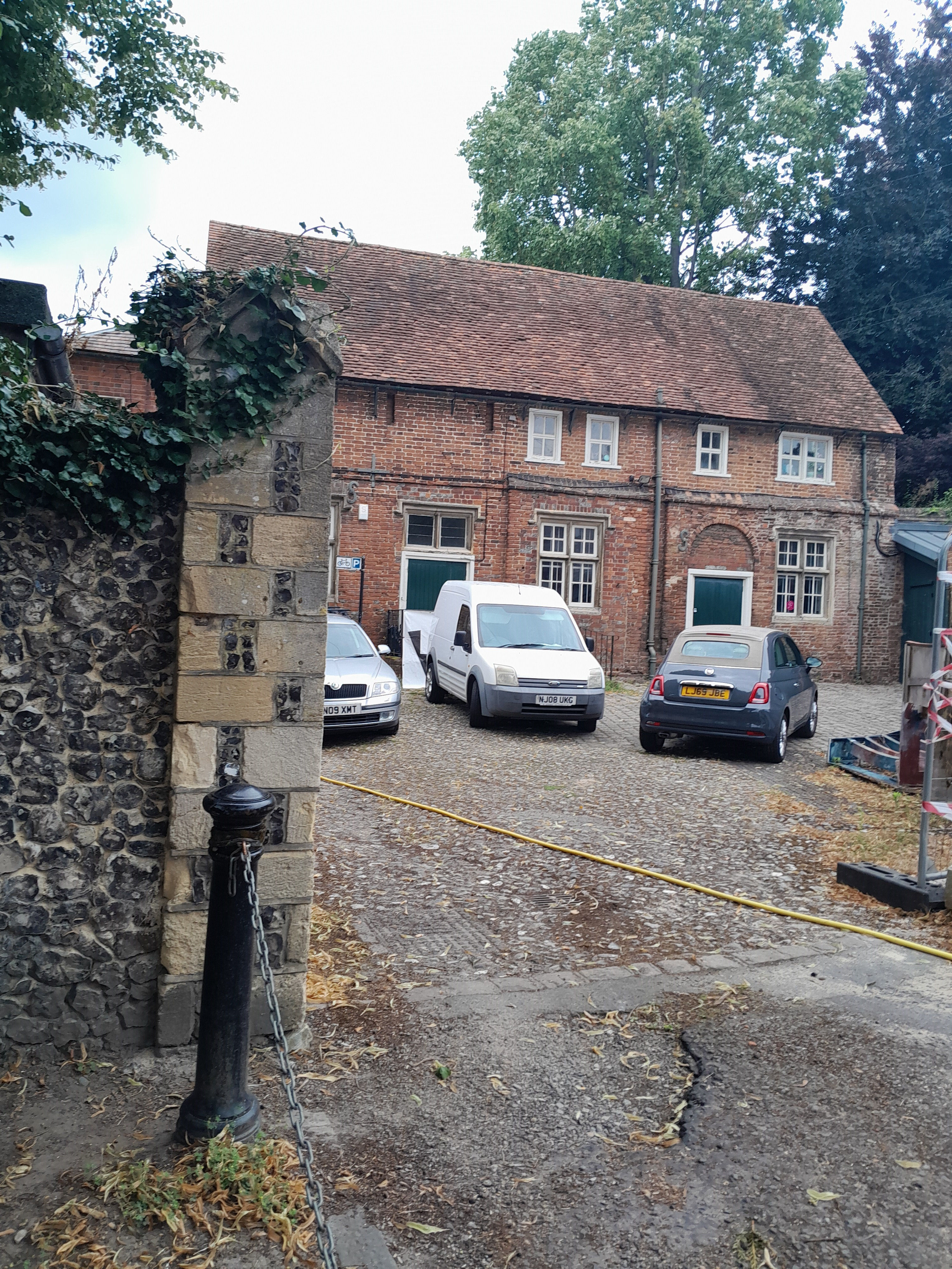 This is on Church Street, near St Peter's, Caversham. There was a grand house here, which has disappeared, but the outlines are marked on the ground. Then there is a lovely garden, with charming little buildings.