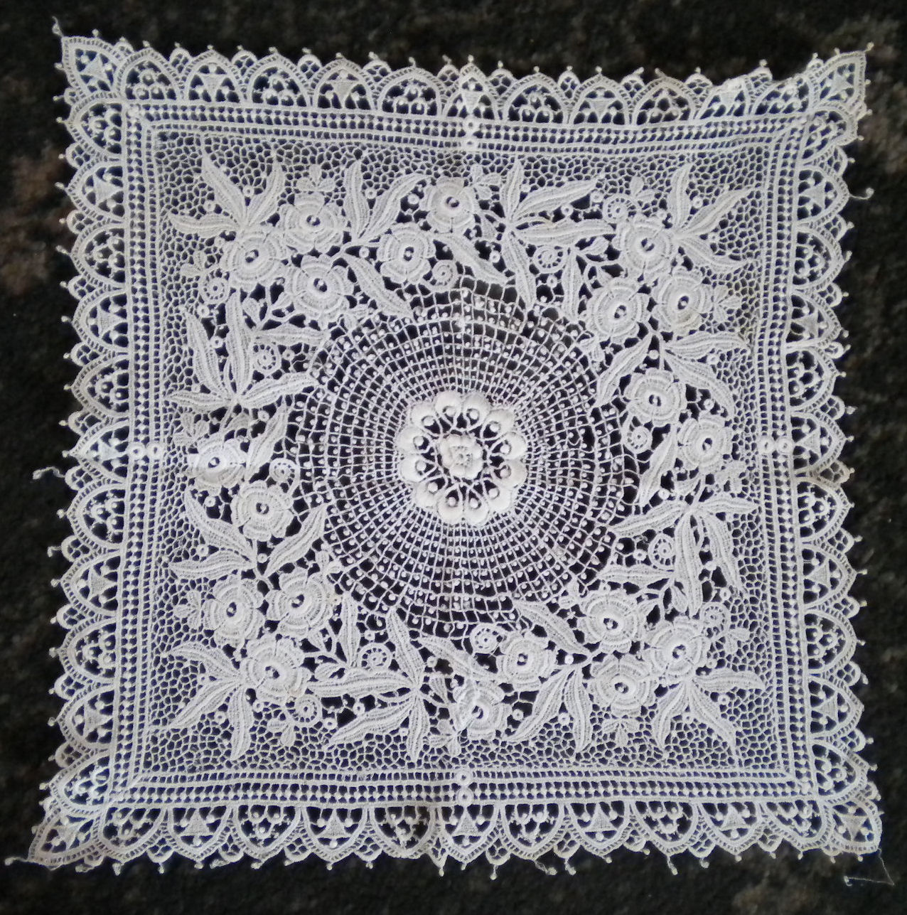 This mat is too big to fit in my scanner (which is how I am reproducing the lace) so I can only show a quarter of it, but the pattern repeats. The whole mat is photographed below to show its shape.