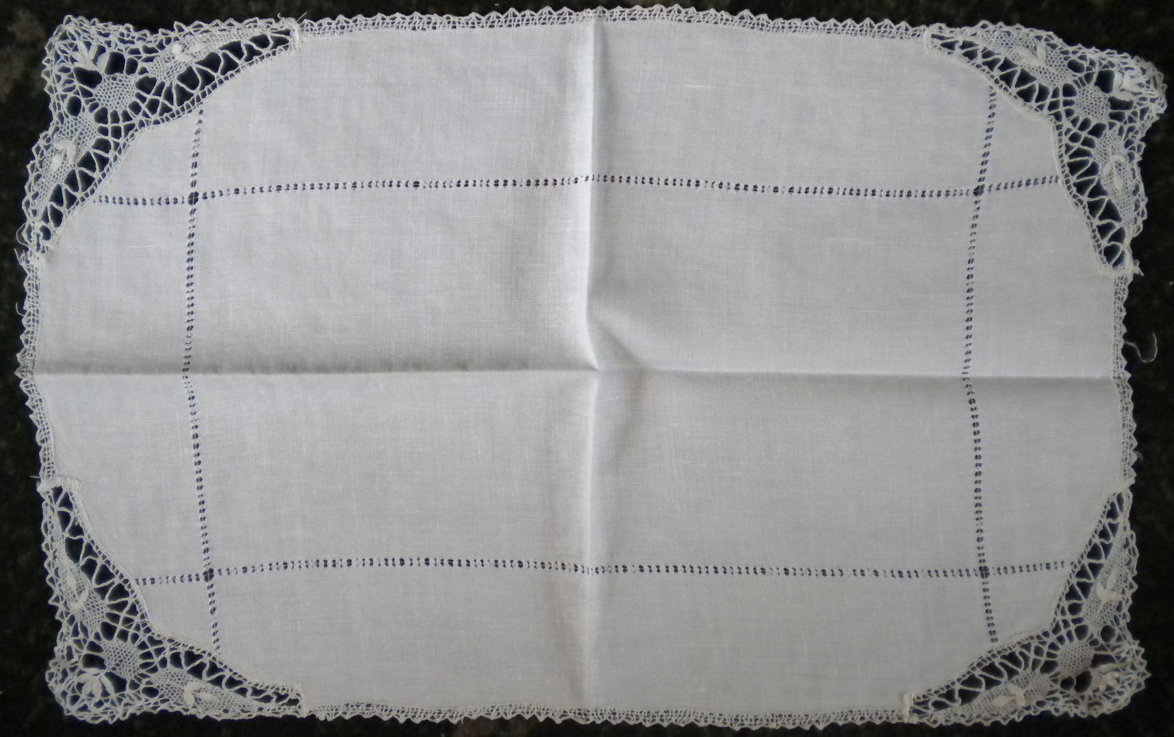 Bedfordshire matThis is a mat mat with lace corners and a little drawn work. The headside looks rather like Maltese lace and the tallies are Maltese shaped, so it's probably Bedfordshire Maltese. There are legs in the headside. There are leaves made of tallies, and half stitch areas, with raised tallies. This piece is too big to fit in my scanner (which is how I am reproducing the lace) so I can only show part of it on the right. The entire piece is photographed below to show its shape. | ![]() |