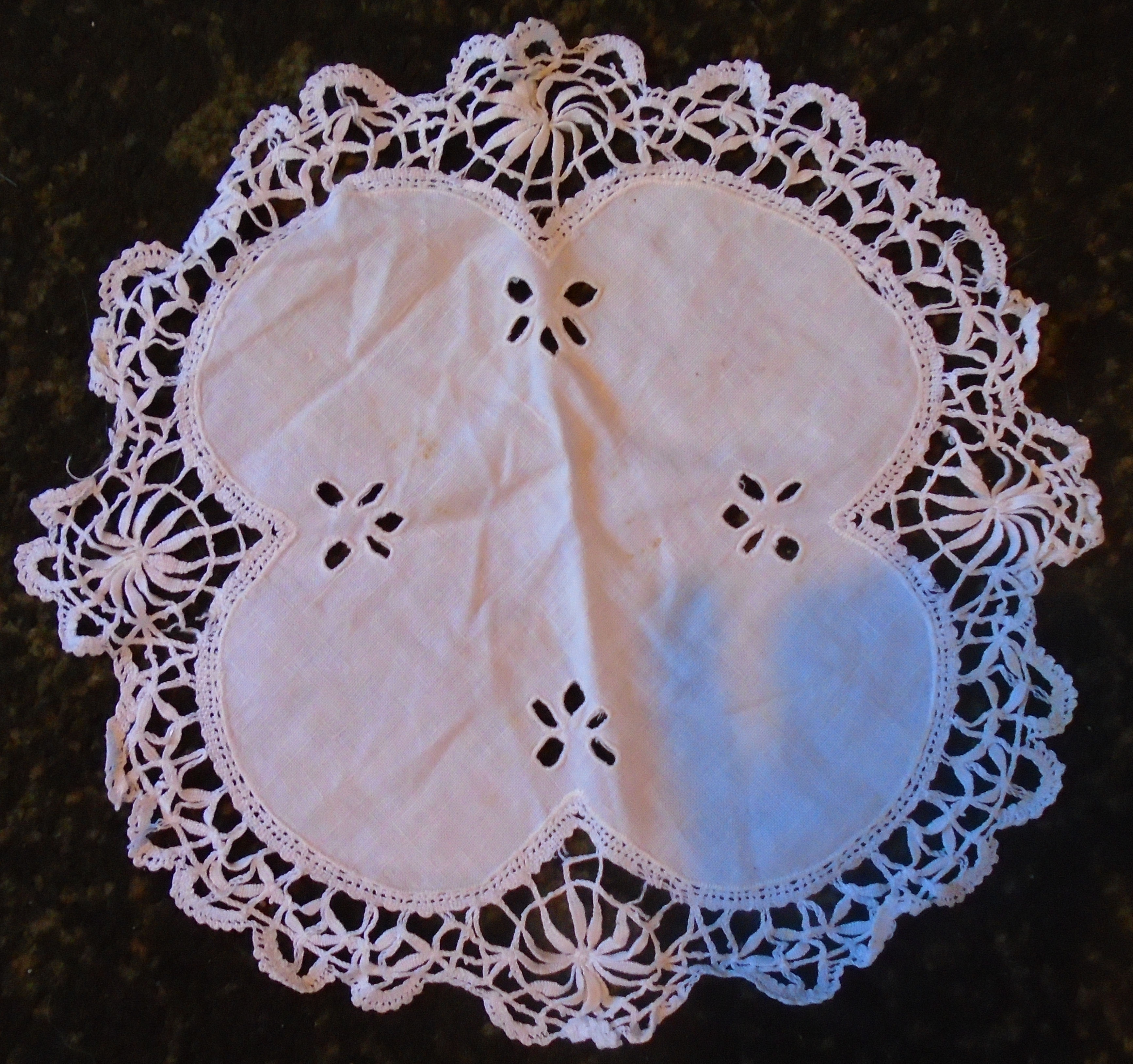 Cluny matI am not an expert, so I'm not sure aboout this identification! But there are no picots, and there is a Cluny edge. This has tallies, with plaits join things. There is a twisted footside. This mat is similar to this one. This piece is too big to fit in my scanner (which is how I am reproducing the lace) so I can only show pieces of it on the right. The entire piece is photographed below to show its shape. | ![]() |