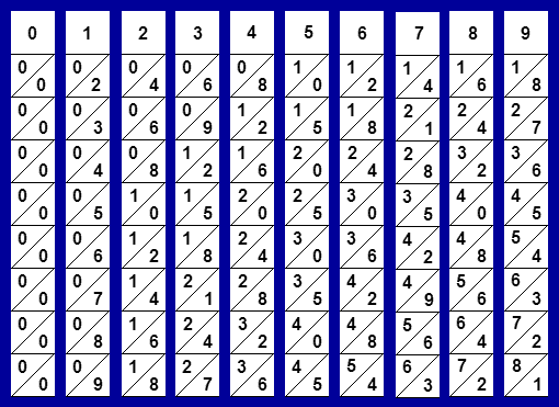 If you look at these strips, you will see that they are really the times tables. Each square gives 2x, 3x, and so on, but the tens and units are divided by a slanting line. You also need a frame to fit them in. The side with the numbers and the bottom are raised slightly, so you can slot the number strips next to them.