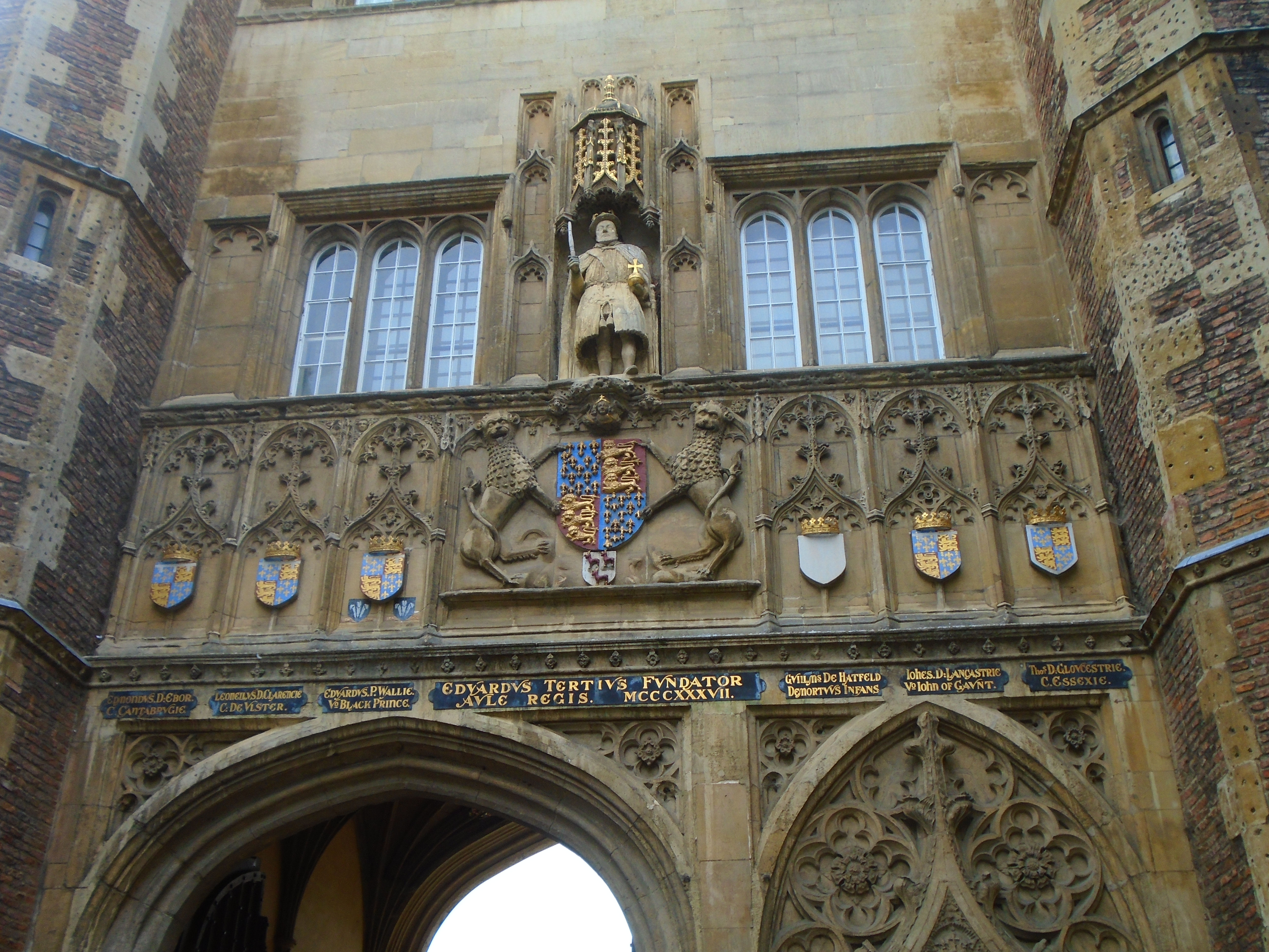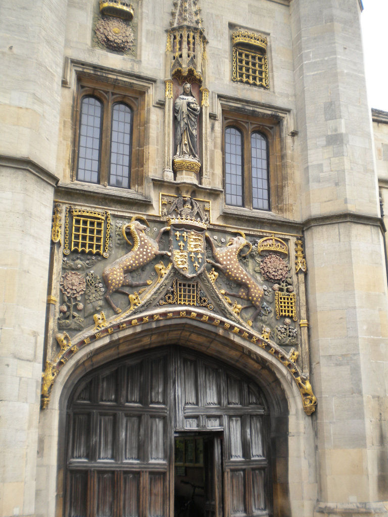 Trinity College's Great Gate was built from 1490-1530. It is listed grade I. Trinity College was founded in 1546 by King Henry VIII, from the merger of two existing colleges, Michaelhouse and Kings Hall. The lower stage of the Great Gate and the flanking ranges are surviving buildings of King's Hall, begun circa 1490 (in Henry VII's reign). This part includes the shields belong to Edward III, founder of Kings Hall, and his sons. Building went on slowly until circa 1505 and then lapsed until 1528-29. The gate tower was completed in 1535, in the reign of Henry VIII, and his statue is above the door. His original sceptre was been replaced by a chair leg (as a student joke). The chair leg is still there.