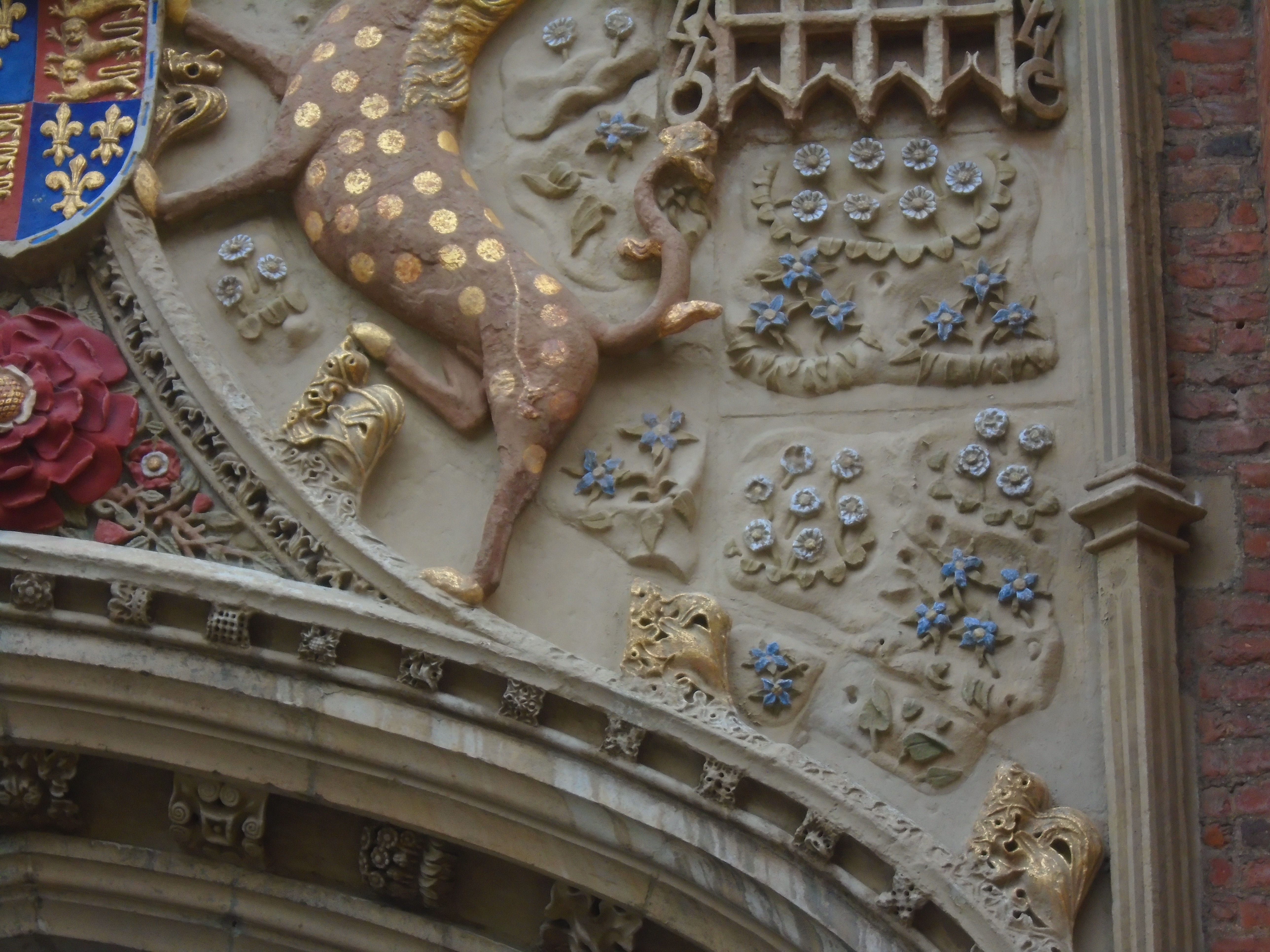 The College Arms are flanked by curious creatures known as yales, mythical beasts with elephants tails, antelopes bodies, goats heads, and swivelling horns. There are daisies (or marguerites - a pun on the name of Margaret Beaufort, who founded the college), speedwell and roses. At the top, there is a rabbit warren, with rabbits, and a fox disappearing down a hole!
