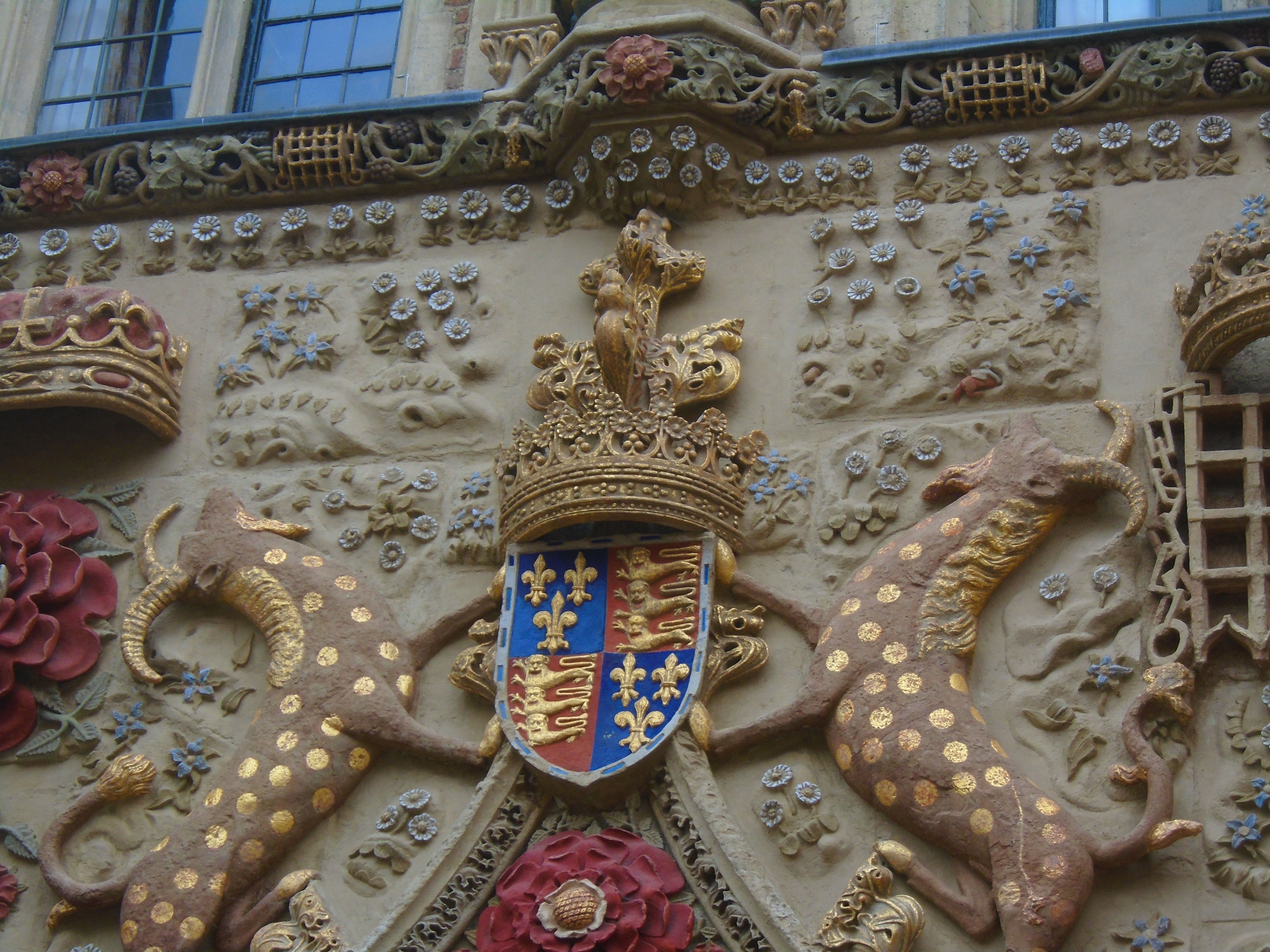 Here is a closeup of Christs gatehouse. Christs gatehouse looks similar to St Johns gatehouse. This may be because Lady Margaret Beaufort founded both colleges, so her coat of arms are on both gatehouses. The supporting animals are called yales. |