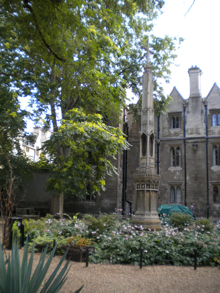 All Saints GardenYou can reach All Saints Garden from Trinity Street, or via All Saints Passage. The church of All Saints in the Jewry which gave the garden its name was demolished in 1865. The cross in the photo marks where it was. You can reach All Saints Garden from Trinity Street. All Saints Garden is small, and does't have much growing in it, although there are a few trees. It is a quiet place to sit. It is useful for taking pictures of St Johns gatehouse across the road, since the road is quite narrow at this point, and it's a big gatehouse! All Saints Garden is mostly known as the location for the Cambridge Art and Craft Market, every Saturday and more often in summer and leading up to Christmas - see their website. |