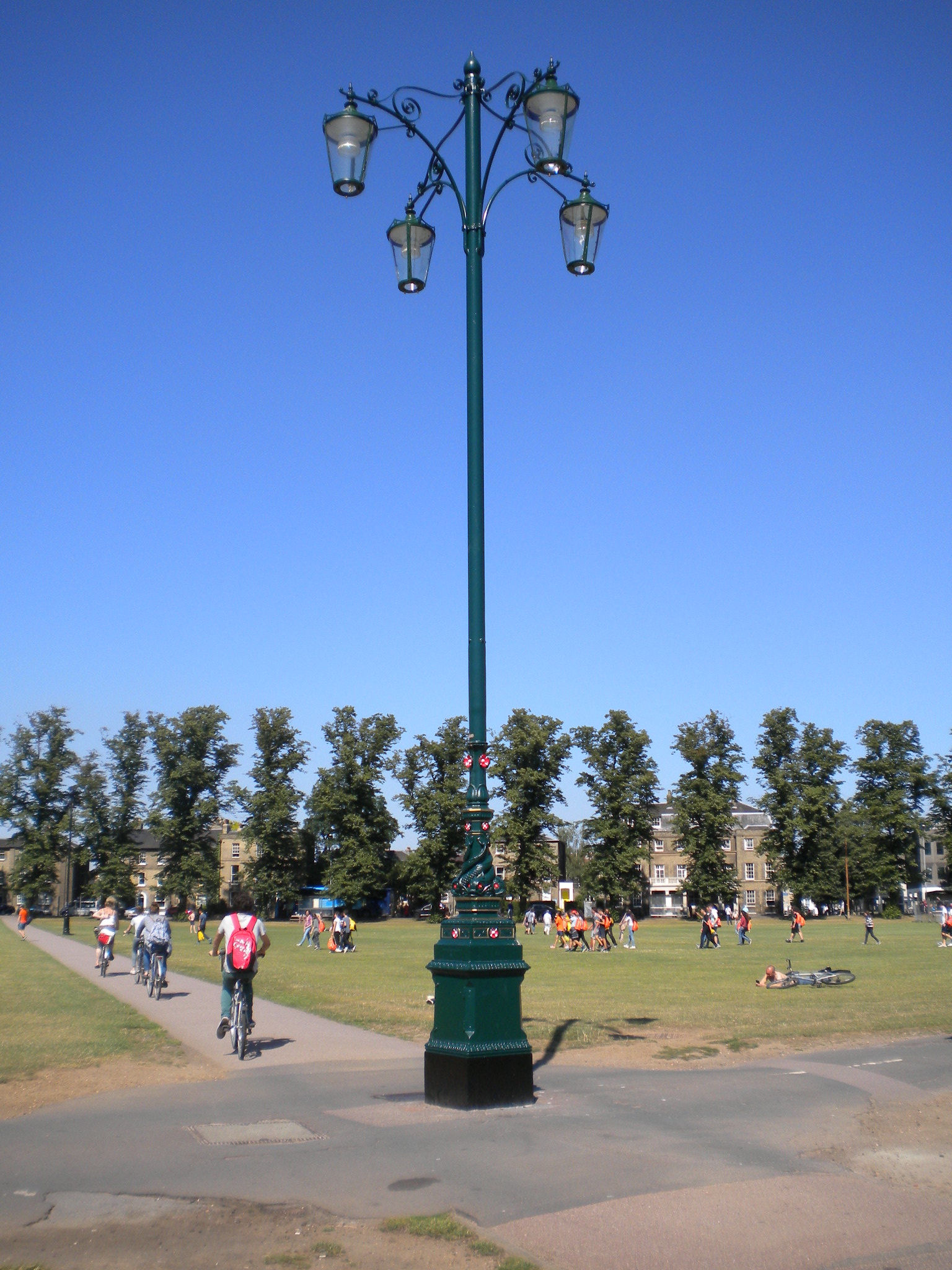This shows the Diana Memorial Garden, with the children's playground behind. The spire of All Saints in Jesus Lane provides the backdrop. There are tennis courts as well, next to the playground, and a bowling green at the other end of the Piece. |