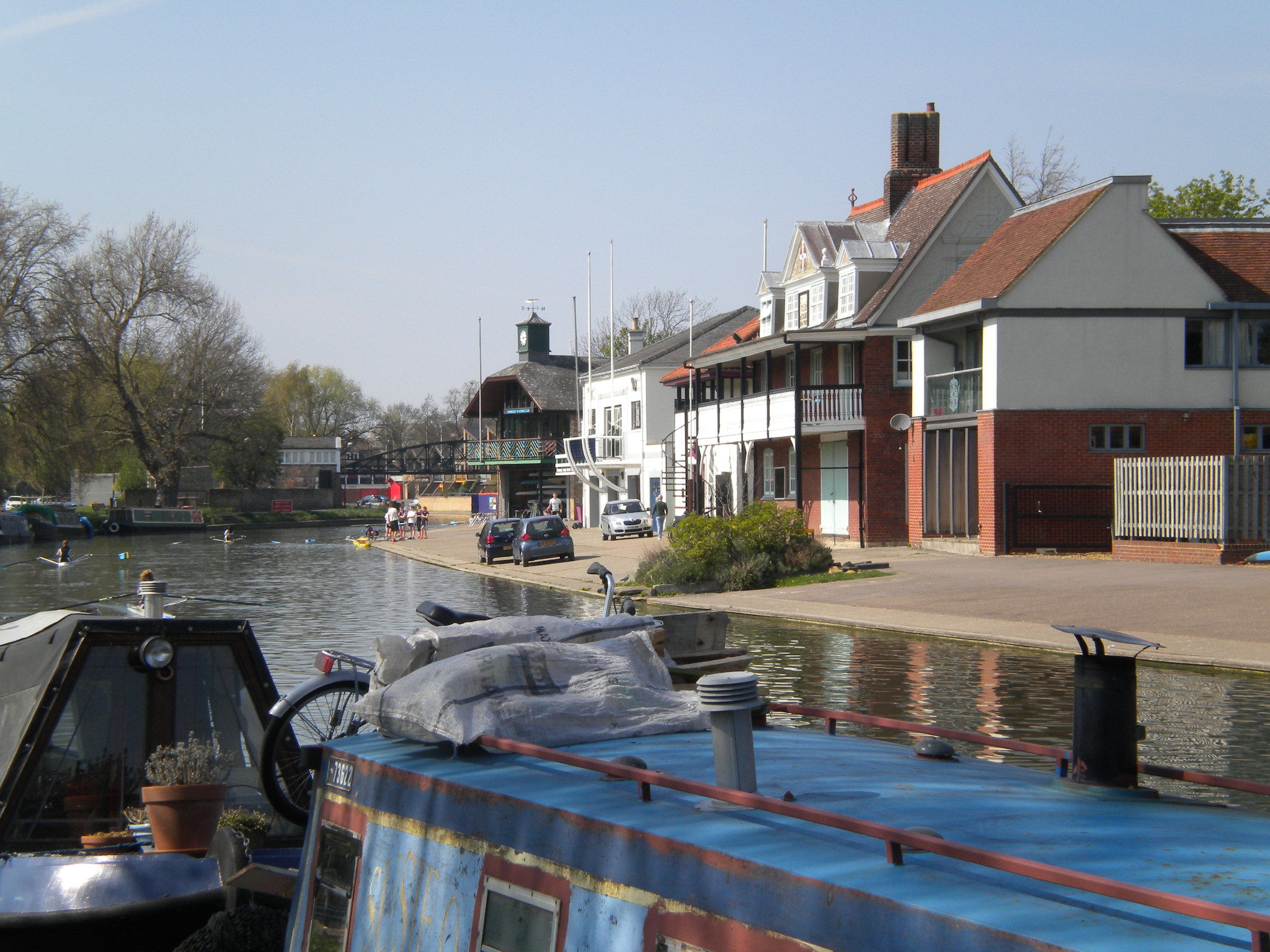 Most of the boat houses are along the north bank of this part of the river. The colleges of Cambridge University have several boat crews each, racing twice a year in the Bumps, a special type of race described below. Each college has its own coloured blades so you can tell which is which. Click here for the colours. There are Town boat clubs as well, some connected with local pubs.