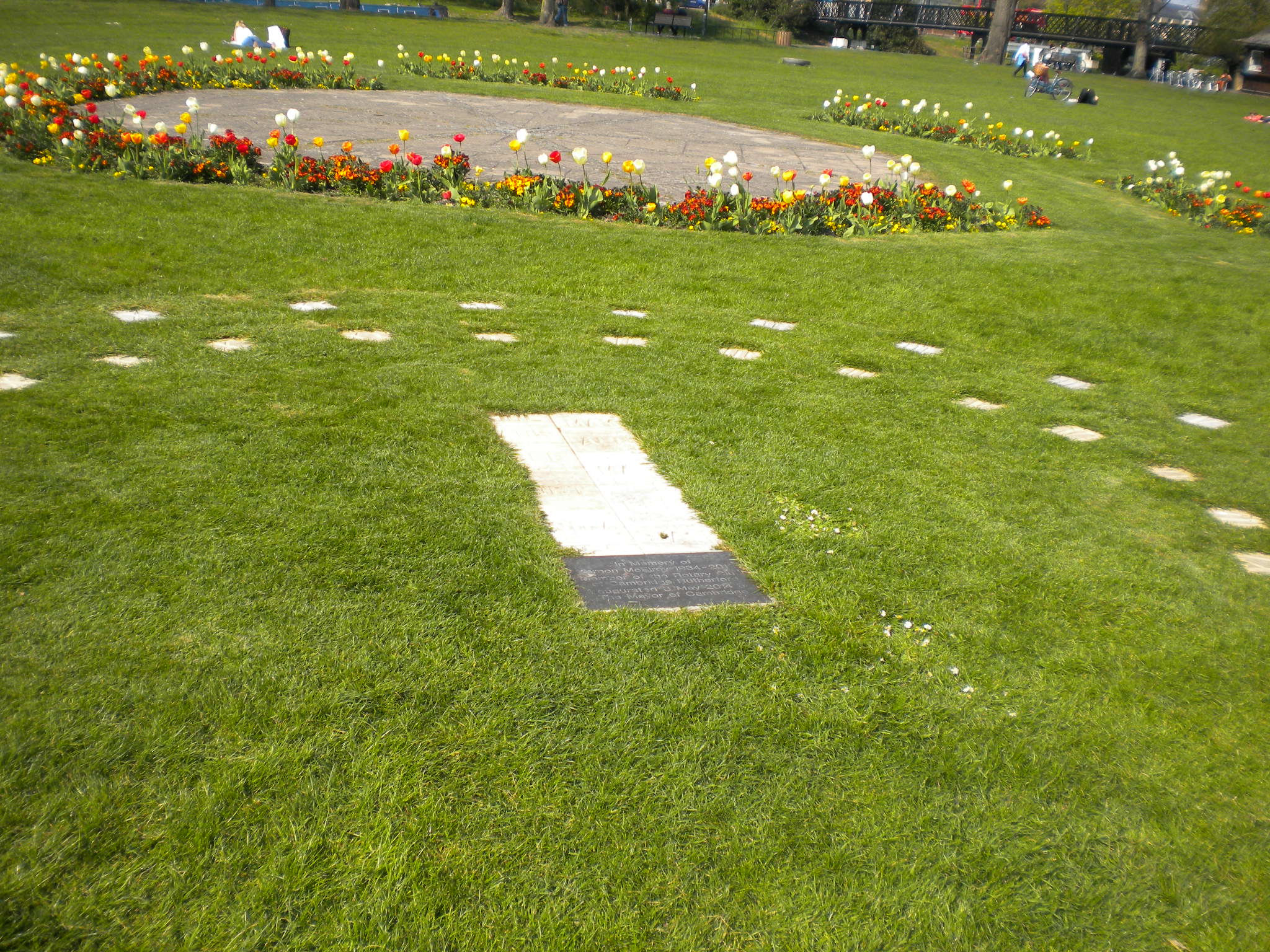 It includes the old bandstand (top of picture) and a sundial. This needs a person to complete it. You stand on the mark, and your shadow shows the time. Click here for more about it. There are photos of this in use in Public Art. |
