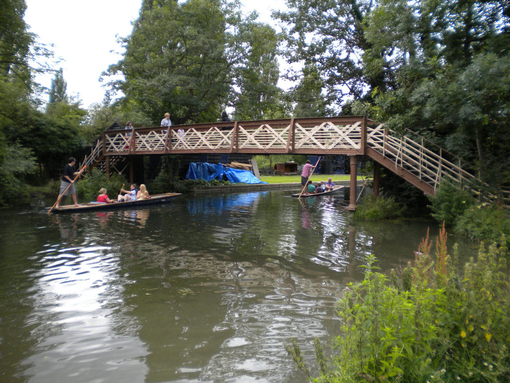 There are punts galore here. You will see that they are in two groups, either side of the weir, those who will travel along the Backs, and those who will head for Grantchester. Cross over the weir. |