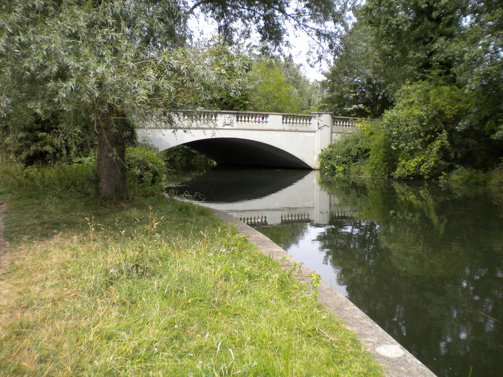 If you look back, you can see Fen Causeway Bridge, opened in 1926. You are still on Sheeps Green, and still on an island, with the main river on your left, and a narrower channel on your right. As you carry on walking, you will head away from the river, and then find an area of neater looking green. |