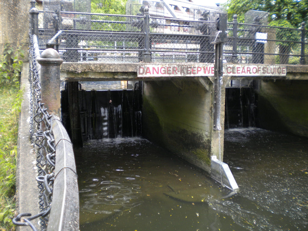 Return back to the weir, and walk along the river. This starts to get confusing, as the river split into two before the weir. You are now walking along the river where most of the punts are. There is rather an ugly sluice gate to your right, When you cross over this, you are leaving Laundress Green. But you are still on an island, since the river to your right (which you can't see from here) and the river to your left (which you can) will eventually meet again. This larger island is called Sheeps Green, since sheep used to graze here. |