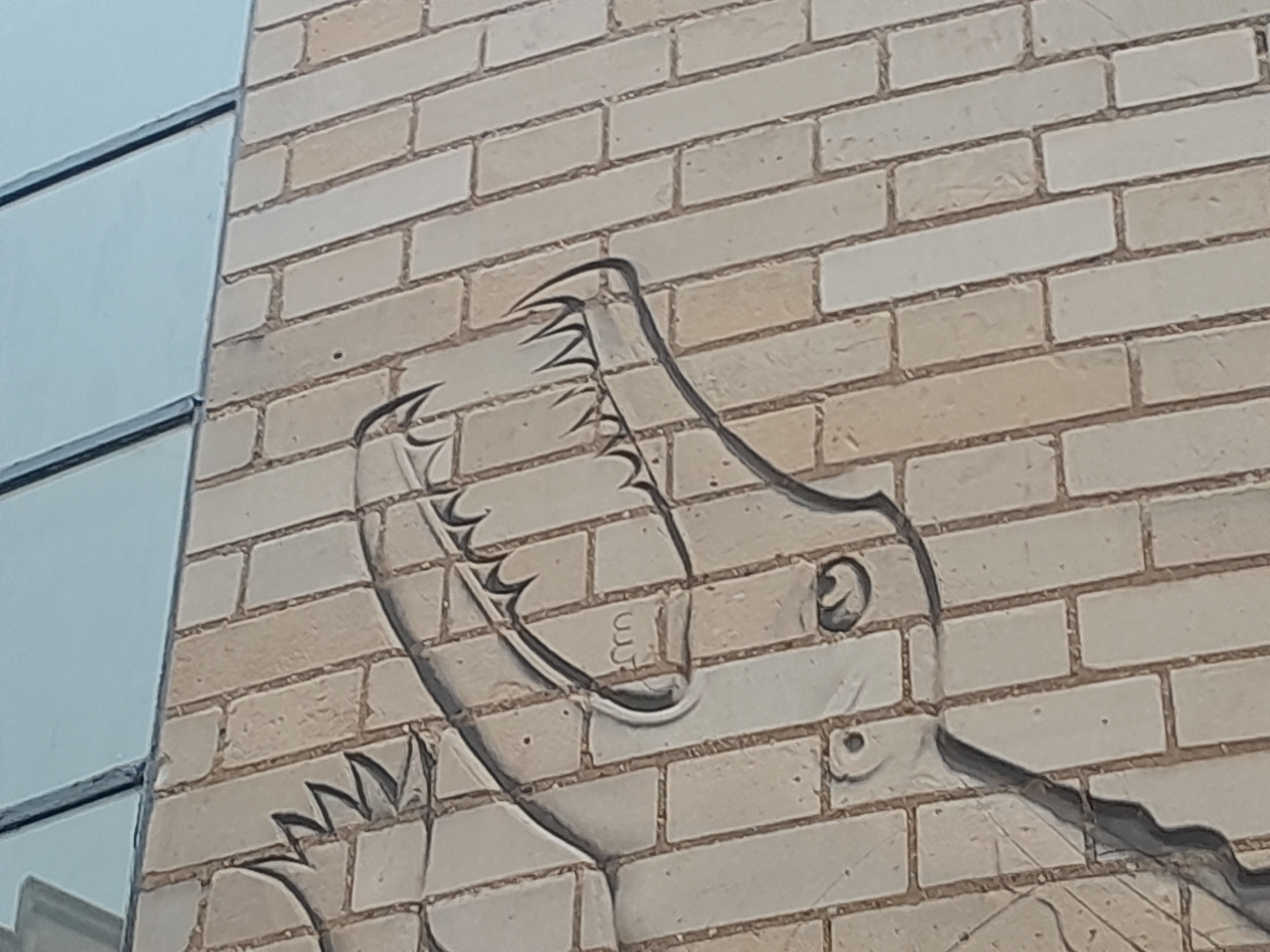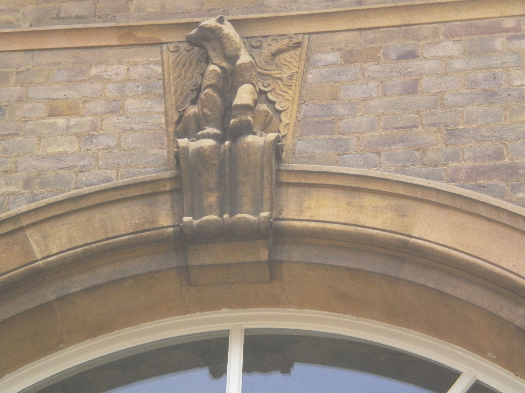 The Sedgwick Museum is in the Downing site, close by. The architect of the Sedgwick Museum was Thomas Graham Jackson and he was responsible for this art (see here. The museum was opened in 1904. The stairs leading to the museum have pairs of splendid animals at the bottom, bears and bisons. Why bears and bison? In 1904 geologists found fossils of bear and bison in the gravels of Barrington, a village south-east of Cambridge. There is also a model of a dinosaur, Clare the Tyrannosaurus rex by Ian Curran (and nothing to do with Thomas Graham Jackson). It was centrepiece at Clare college's "Primordial" May Ball in 2014, and then acquired by the Sedgewick Museum, which involved moving it through the centre of Cambridge! See more here.