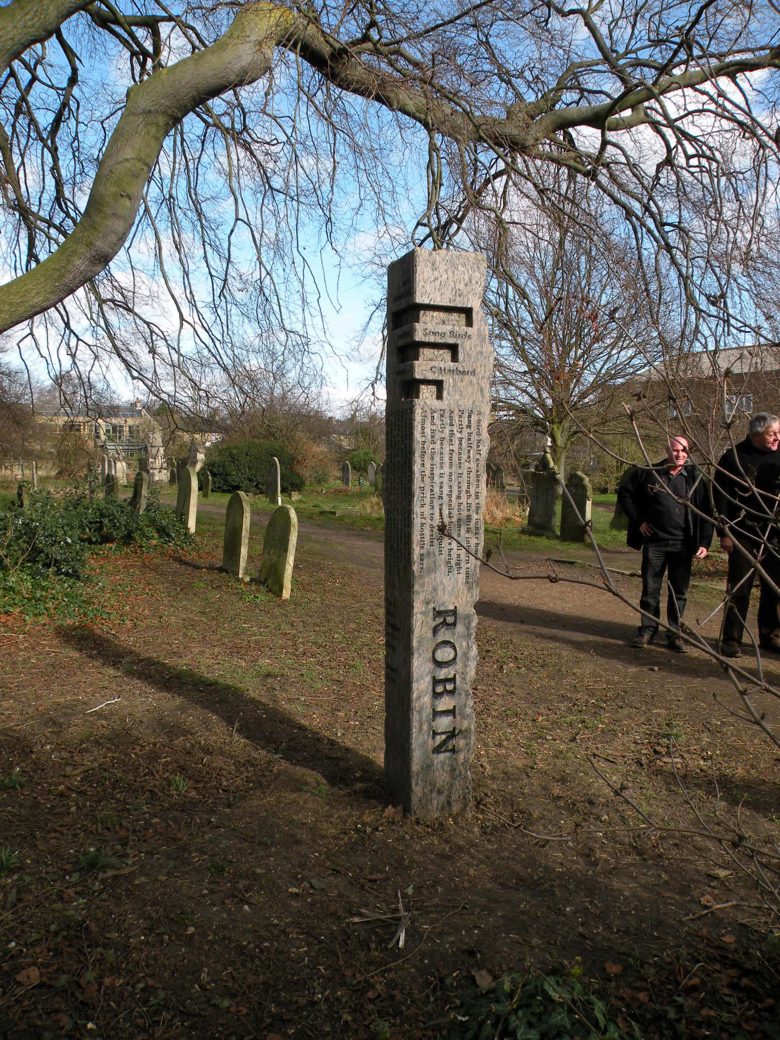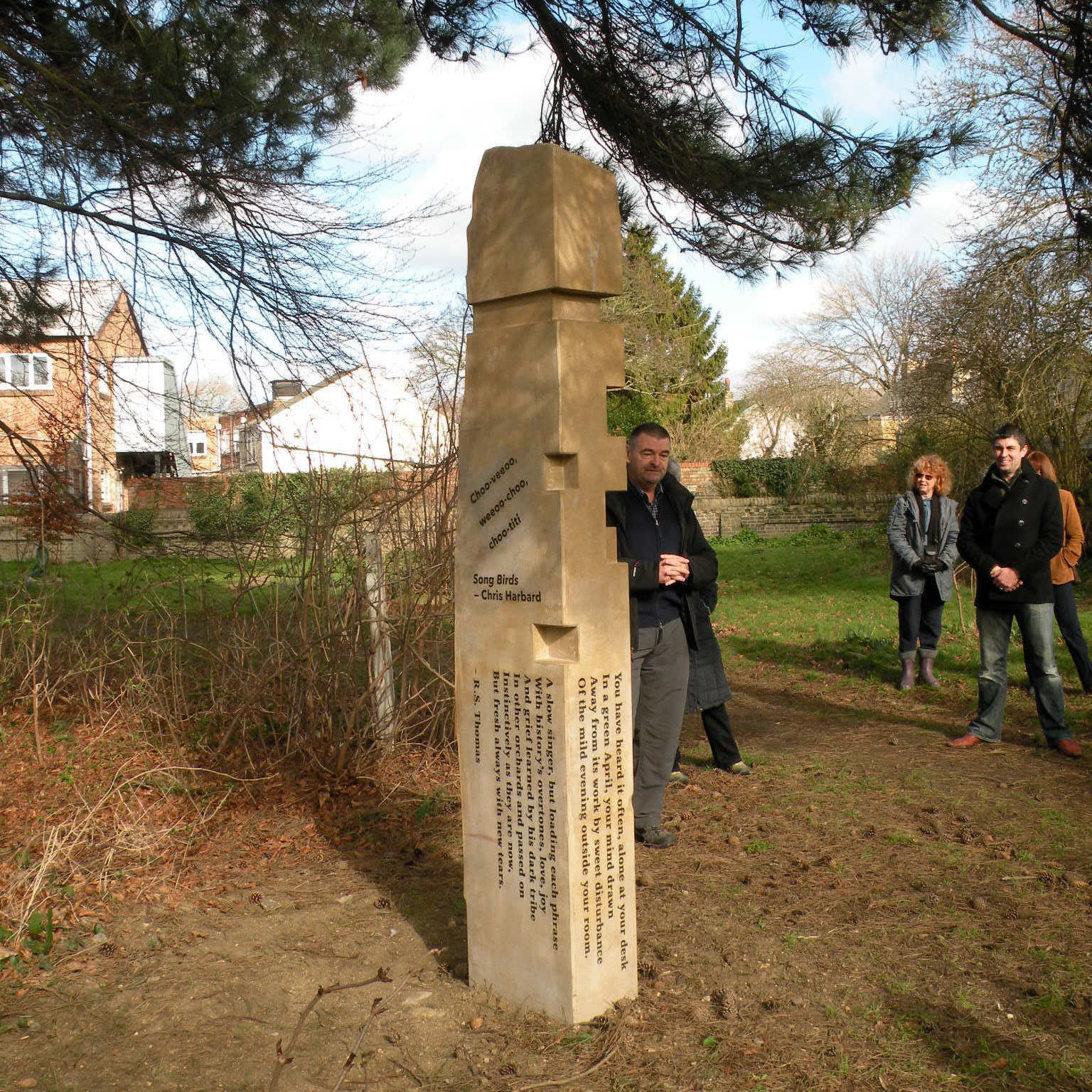 Bird Stones, Mill Road cemeteryIn Mill Road cemetery, there are a number of sculptures called Bird Stones. These are by the sculptor Gordon Young in 2014. His website describes the artwork. It says "The work was inspired by the cemetery's bird life. Each of the sculptures celebrates a species and their location found within the space, each work features bird poetry and a description of their calls." There are perches for the birds, and a groove along the top is intended to hold rain water, for the birds to drink. Most of the sculptures are stones, but one is made of wood, from the tree that used to be outside Holy Trinity in Cambridge City centre.