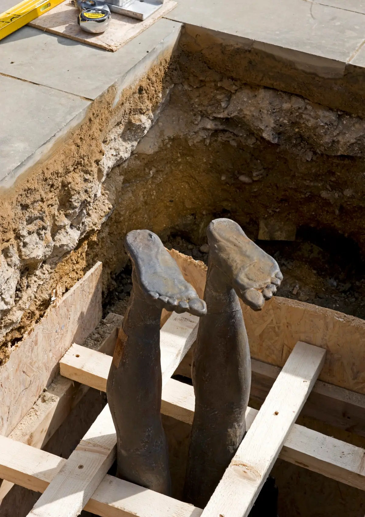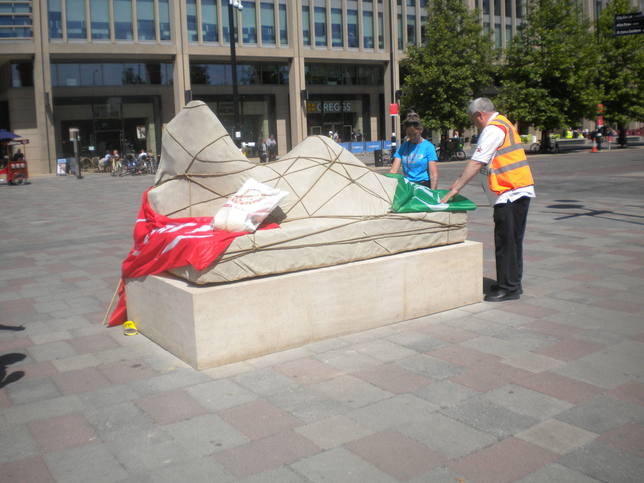 The entrance of the Downing Site is in Downing Street. Walk in and turn slightly towards your left. In the paving, you will see two human-sized foot prints (see right). Apparently this installation is a human figure buried up side down with only the soles of the feet showing. There is no information near-by about it, and you can walk right over it without seeing it if you're not careful. It is dated 2002, and it is called Earthbound: Plant. Here are some photos of it being installed, from here.