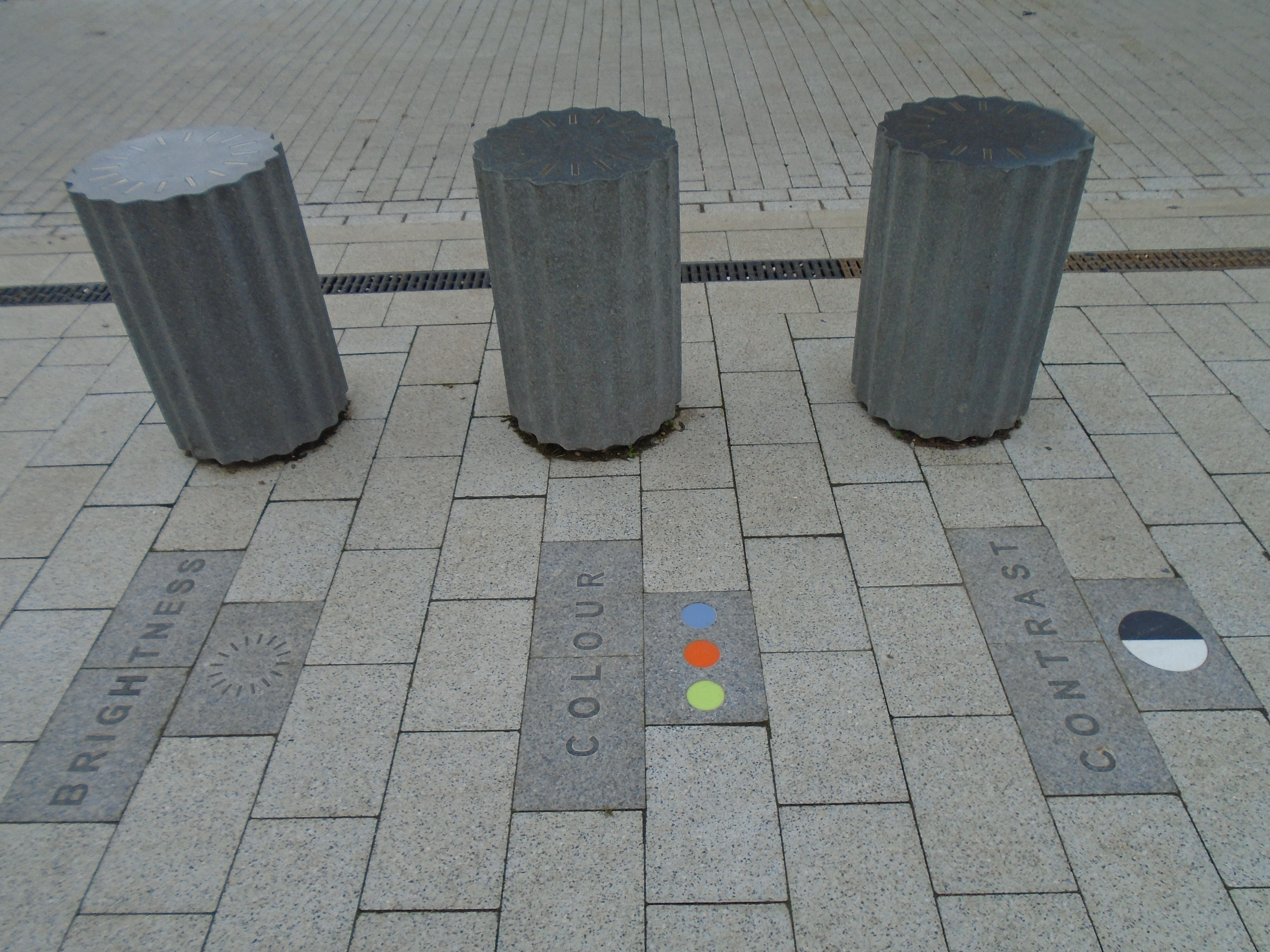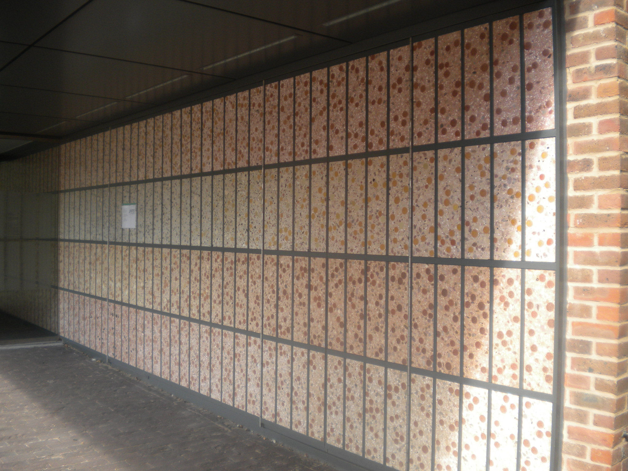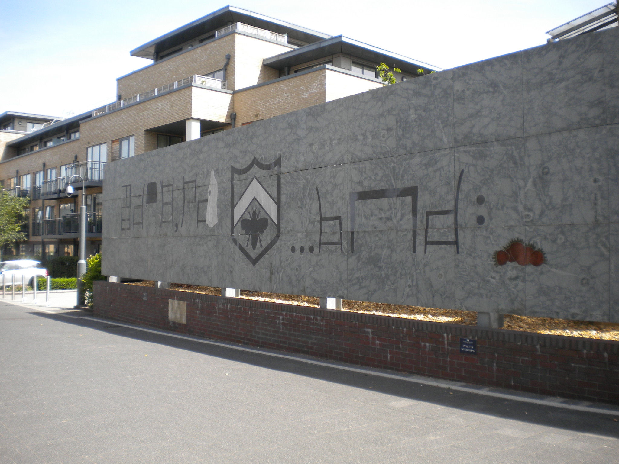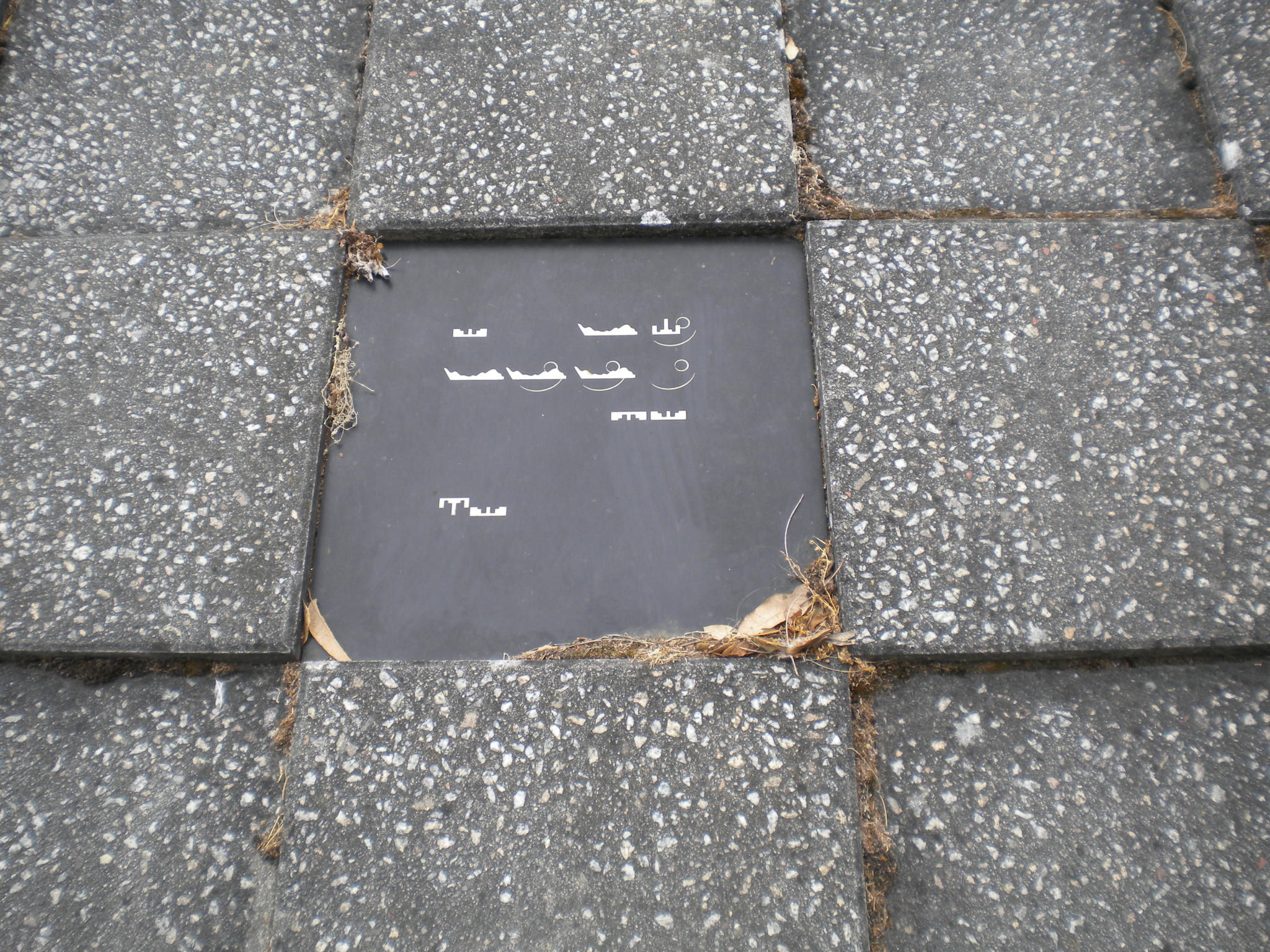 Closer to West Road, there is a bank of grey stone, with insets. If you go round the back of it, it's a cycle park! One of the insets says "Christine Kettaneh, mute melodies, 2013, [A:L:L]". Her website about the artwork is here, where she says "I wonder what would result if I asked key cutters to save all the metal filings - that metallic dust that gets lost when the keys are cut. What if I collected them? What if I restored the wholeness back to the keys?"