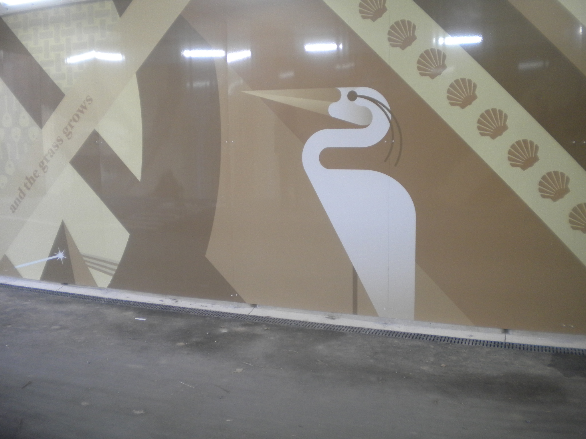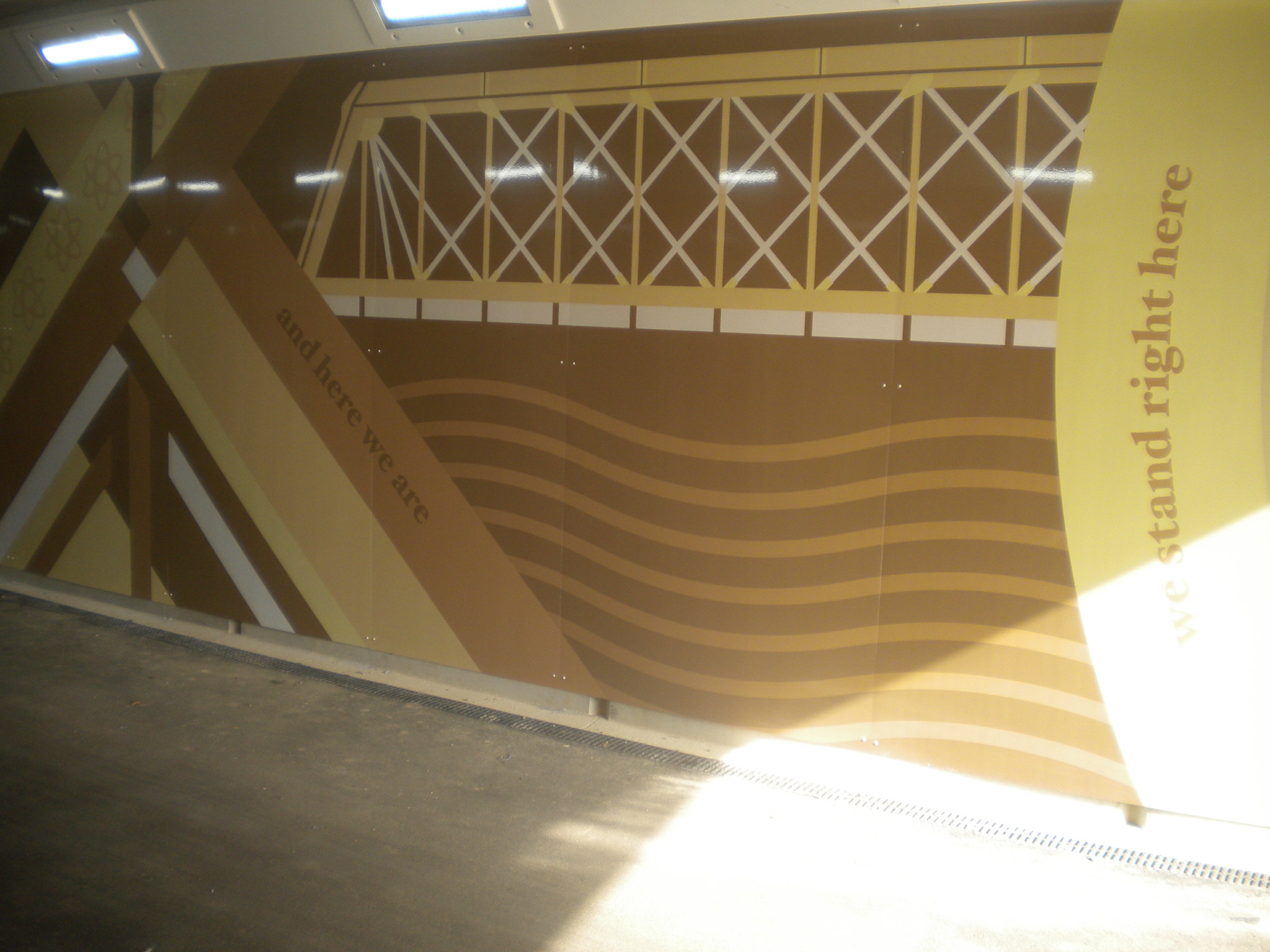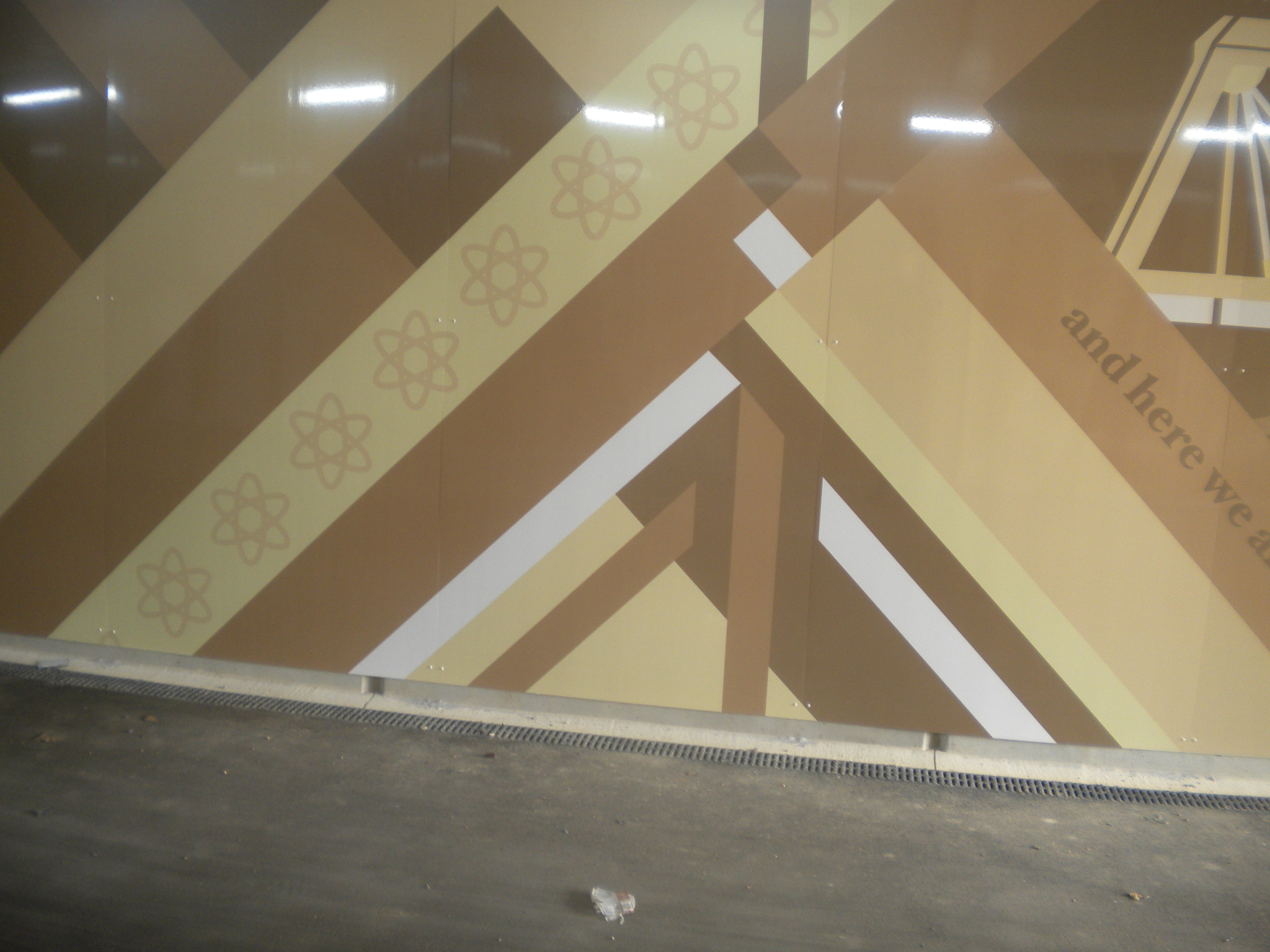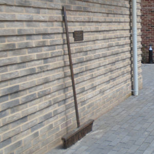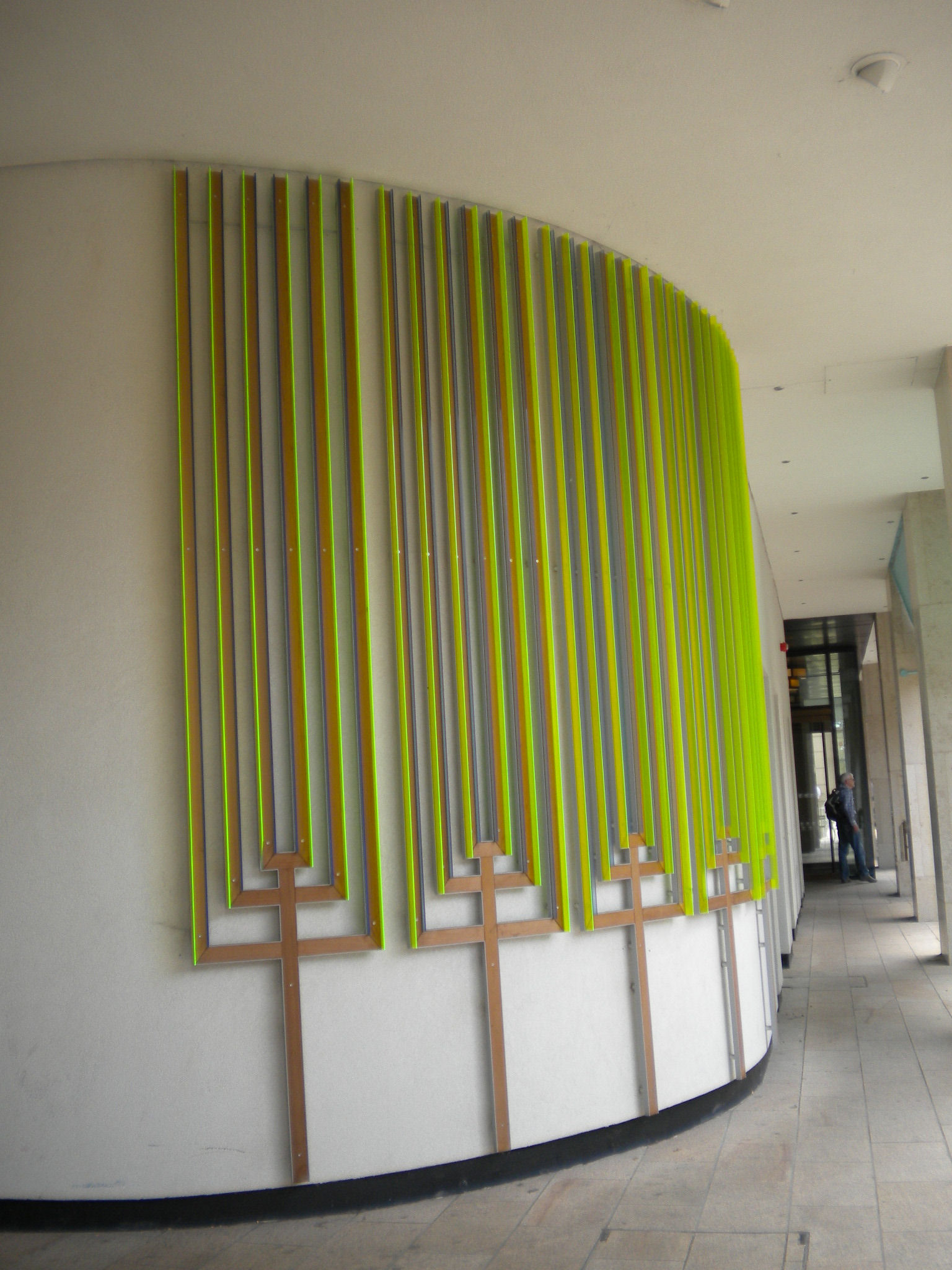 Closer to West Road, there is a bank of grey stone, with insets. If you go round the back of it, it's a cycle park! One of the insets says "Christine Kettaneh, mute melodies, 2013, [A:L:L]". Her website about the artwork is here, where she says "I wonder what would result if I asked key cutters to save all the metal filings - that metallic dust that gets lost when the keys are cut. What if I collected them? What if I restored the wholeness back to the keys?"