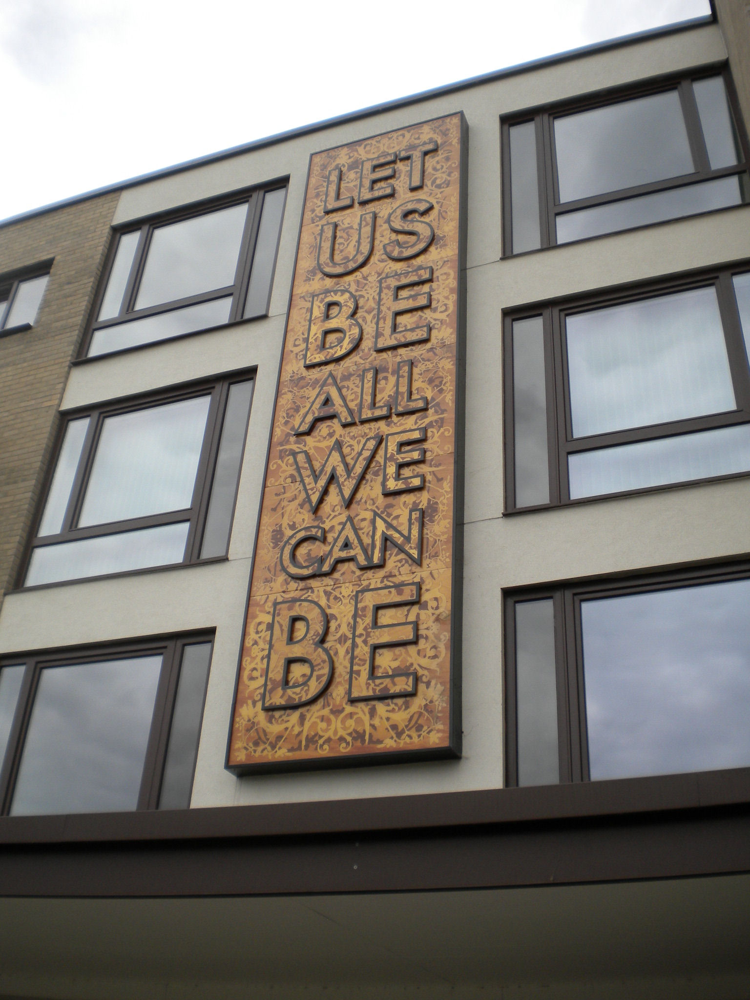 After entering the Downing Site, turn to your right. This sculpture is by the back door to the Arc and Anth museum, which is in the corner. There is a board nearby, which says: