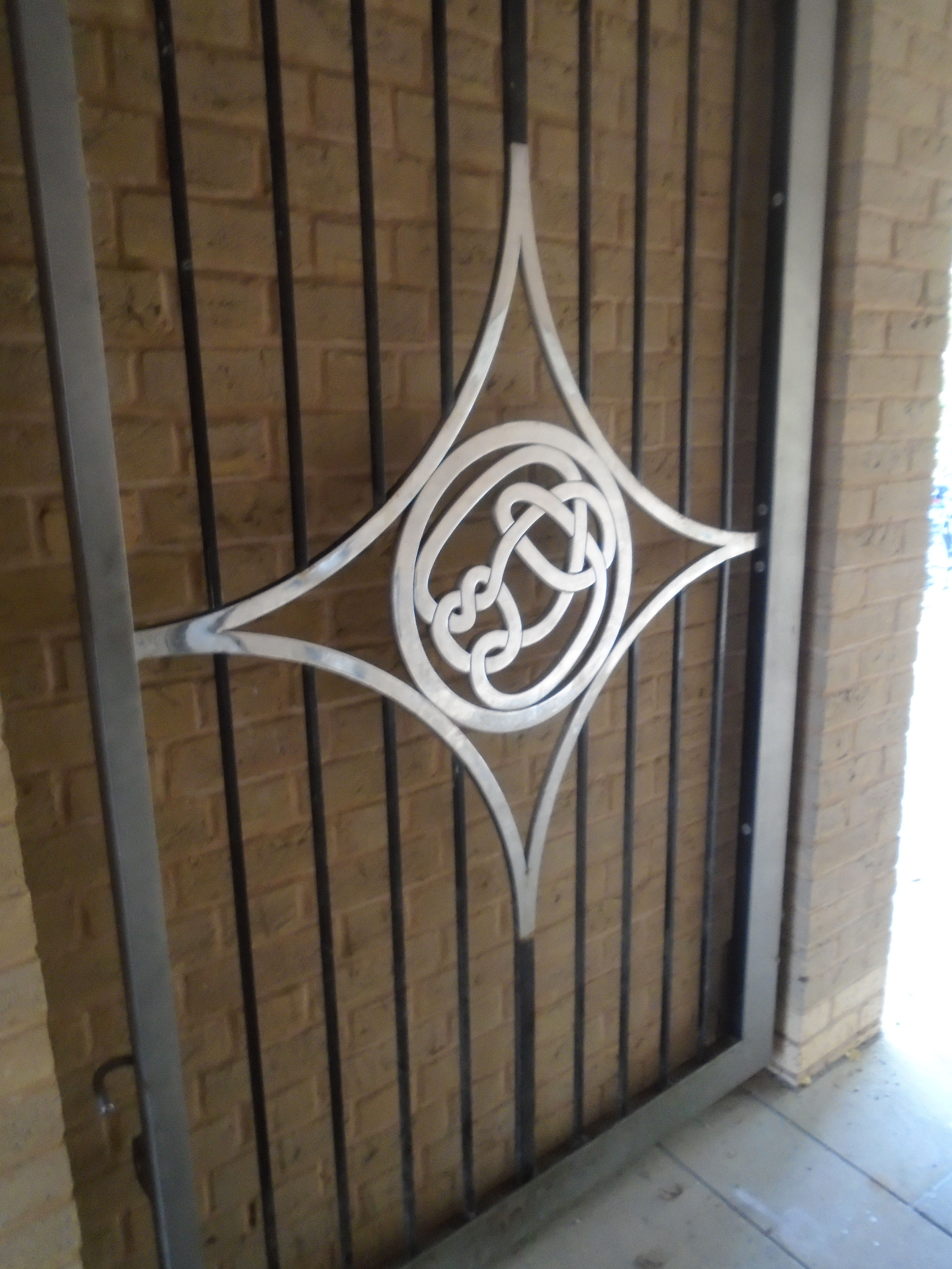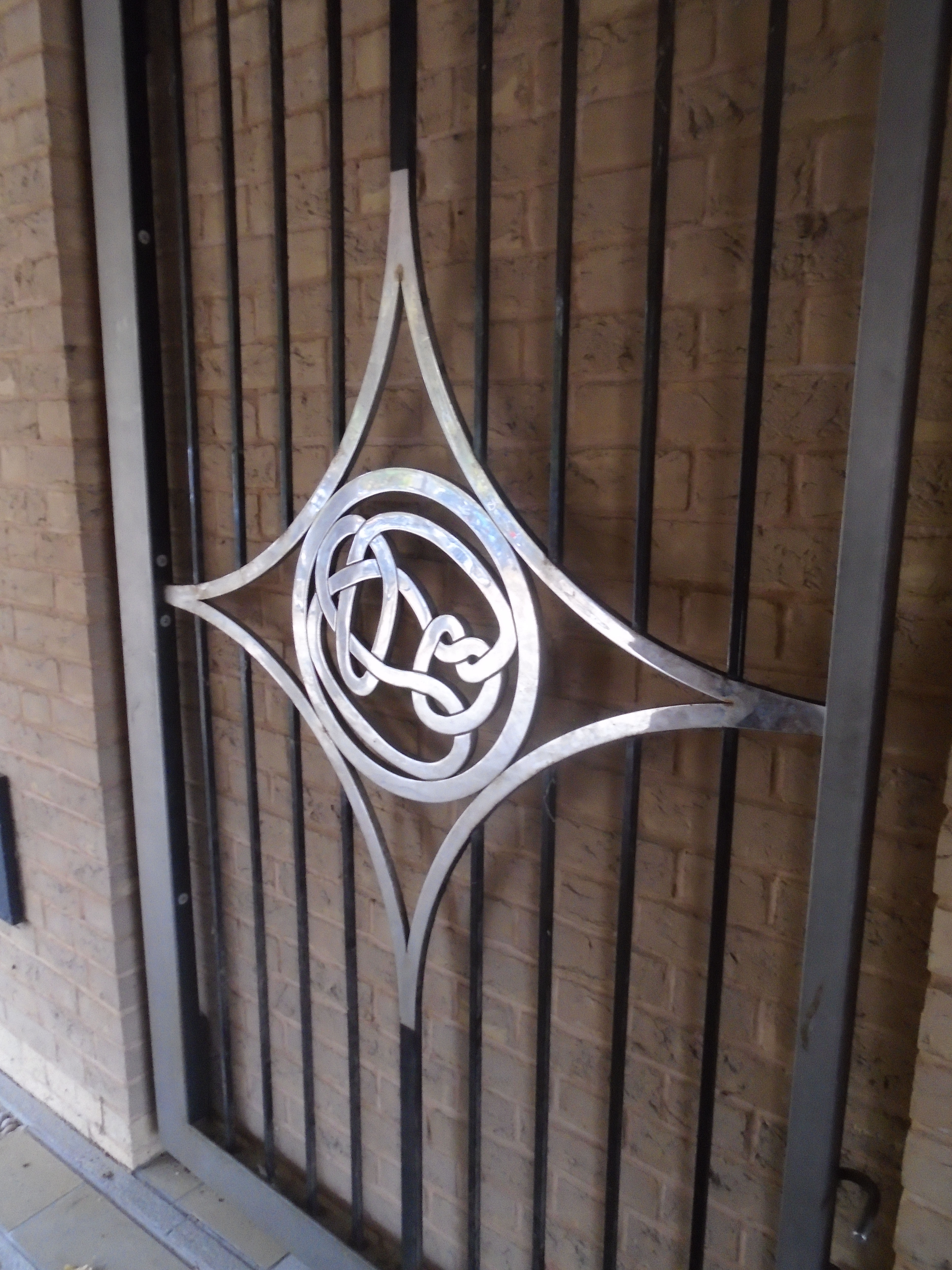 By the side of the Isaac Newton Institute runs a passage from Madingley Road to Clarkson Road. Halfway along is the Faulkes Gatehouse (see photo below). This contains Mathematical Gates by John Robinson (1970). These depict two knots each with eleven crossings. The knots are distinct from each other but you will need to look very closely at both gates to see the subtle difference between the two knots. The south gate shows the knot discovered by J H Conway, a Cambridge mathematician in 1970. The north gate shows a knot studied earlier by Kinoshita and Terasaka.