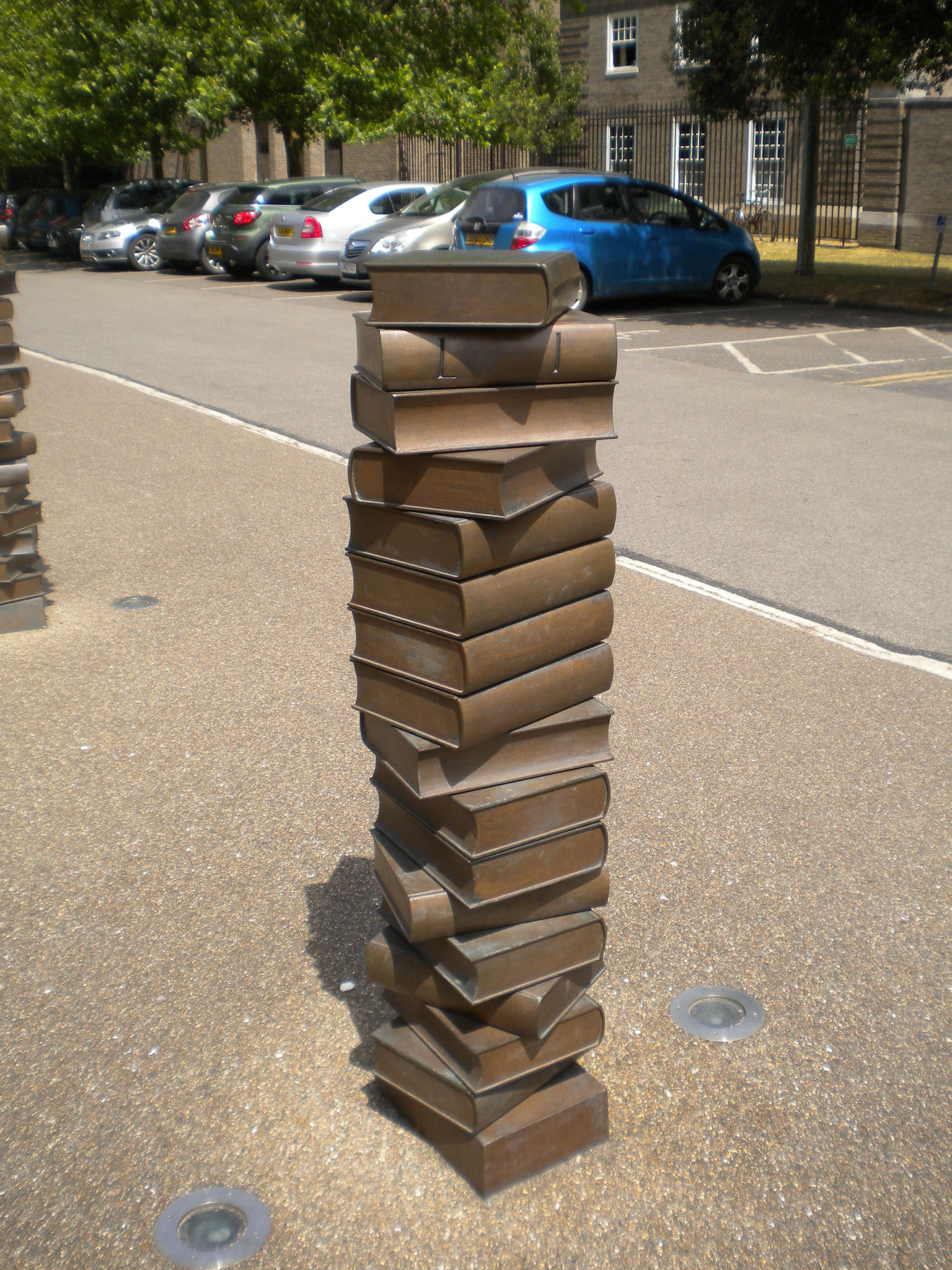 There is a line of stacks of books (in bronze) in front of the UL (University Library). This is called Ex Libris, by Harry Gray, dated 2009.