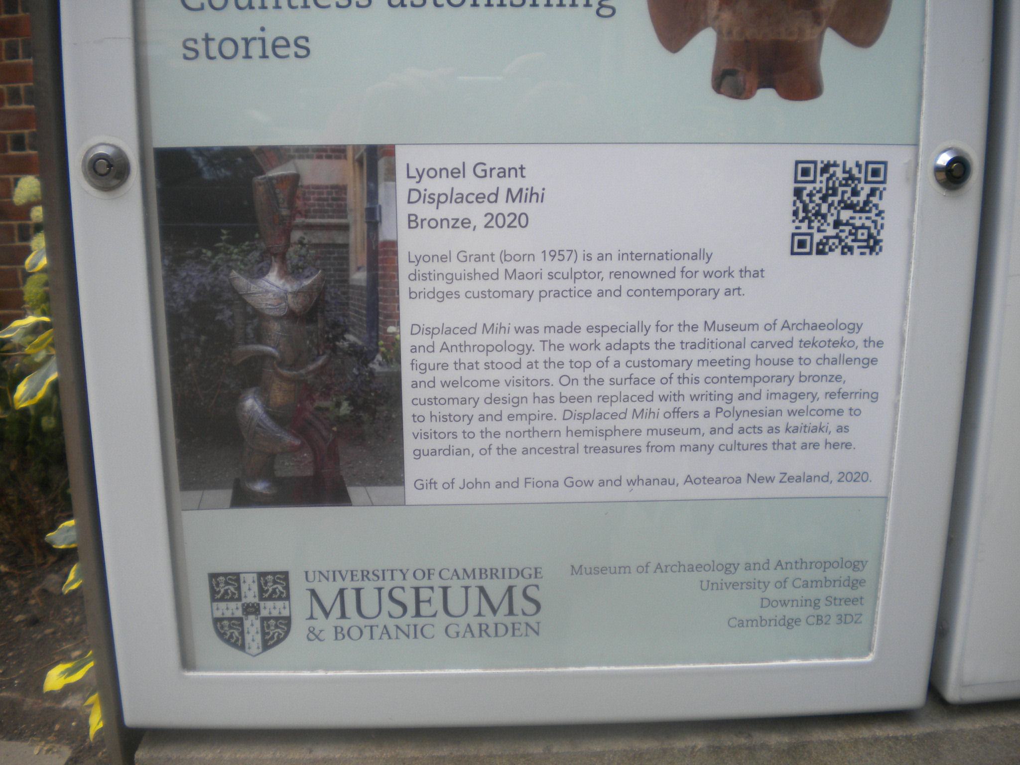 Displaced Mihi was made especially for the Museum of Archaeology and Anthroplogy. The work adapts the traditional tekoteko, the figure that stood at the top of a customary meeting house to challenge and welcome visitors. On the surface of this contemporary bronze, customary design has been replaced with writings and imagery, referring to history and empire. Displaced Miki offers a Polynesian welcome to visitors to the northern hemisphere museum, an acts as kaitiaki, as guardian, of the ancestral treasures from many cultures that are here.