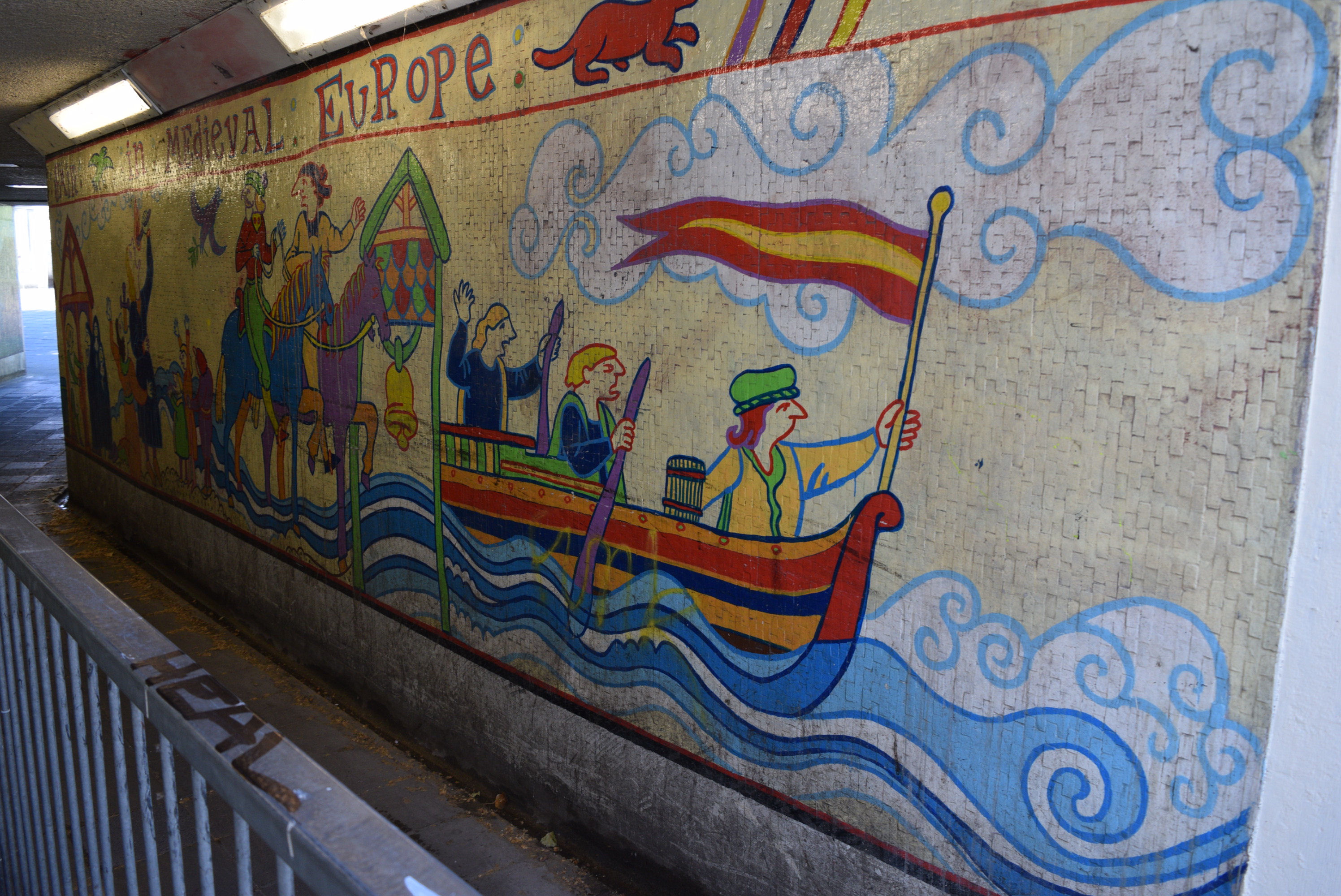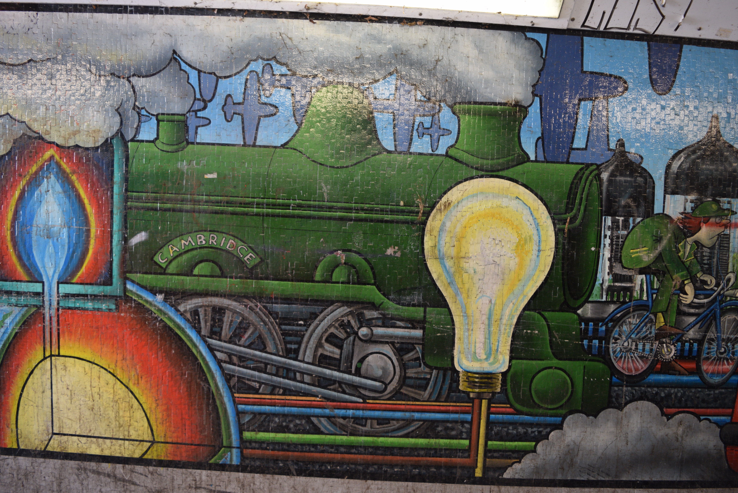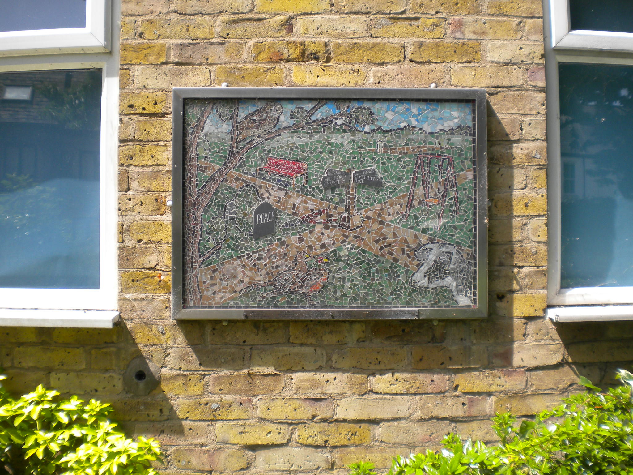 CamLETS mural, Parker's PieceRound the back of Hobbs pavilion, there is a mural about CamLETS. LETS stands for Local Exchange Trading System. It is a way a community can trade skills, services or goods without needing or using real money. There is a small plaque in the centre saying "Cambridge 2000 - Sustainable City" and on the mural it says "Act locally" and "CamLETS". There was a Cambridge City Council community arts project funded by the Millennium Priority Development Programme for community groups to make mosaics and this is the CamLETS one. A description connected with another mosaics in the project says "The mosaic is part of a larger project called Mosaics for the Millennium. This is a partnership between Cambridge Sustainable City and the City Council's Community Arts Team inspired by Local Agenda 21, offering groups the opportunity to make a mosaic for their chosen site celebrating this special year. Local Agenda 21 is a plan for the 21st century adopted by the City Council which seeks to secure a sustainable future for the city by embracing the three E's - Economy, Equity and the Environment. Groups explore these themes artistically in their mosaics." |