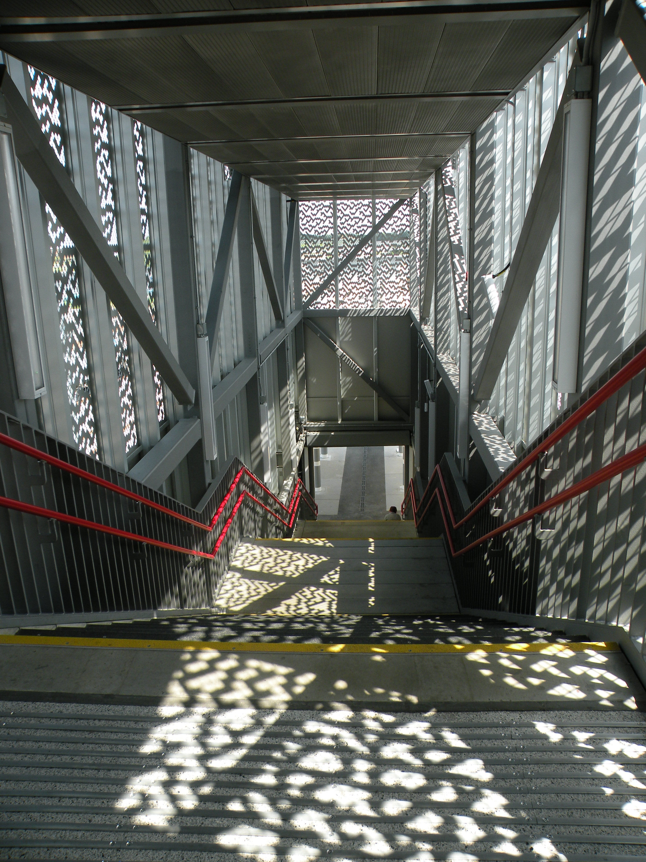 Trellis, Thompson LaneThis website about a development in Thompson Lane says "Public Art for this development comprises an artwork designed by artist Cath Campbell to both compliment and deliberately disrupt the architectural rhythm and aesthetic of the space. Cath created an intricately woven permanent timber sculptural installation for the south corner of St Clement's Gardens, beginning at ground level and reaching to the third storey. The artwork creates both a sculptural object and a functional support for a planting scheme that will be trained across the artwork. This significant feature provides a focal point for the building that can be viewed from Bridge Street." It doesn't seem to have a name, but its function is a trellis. |