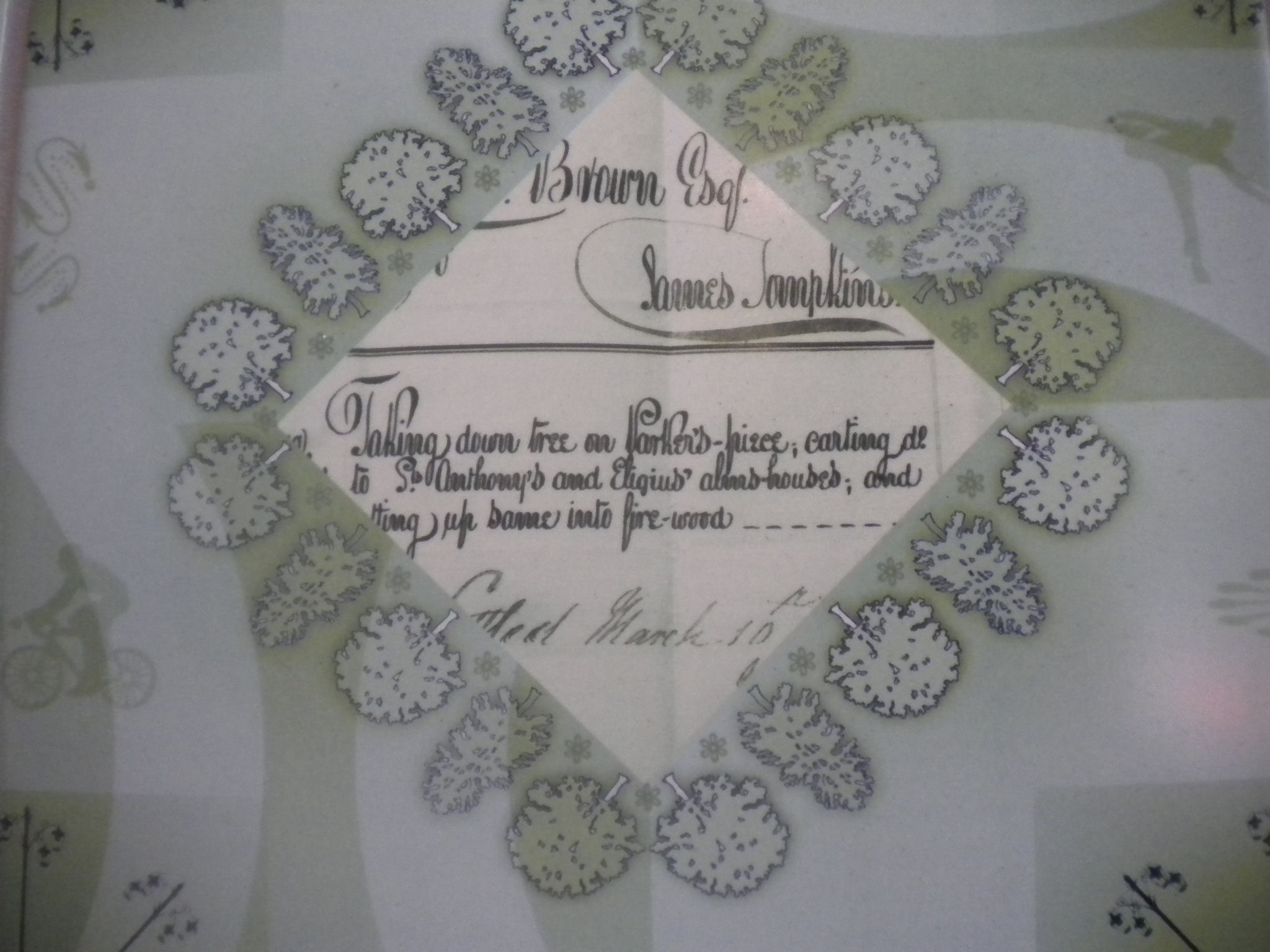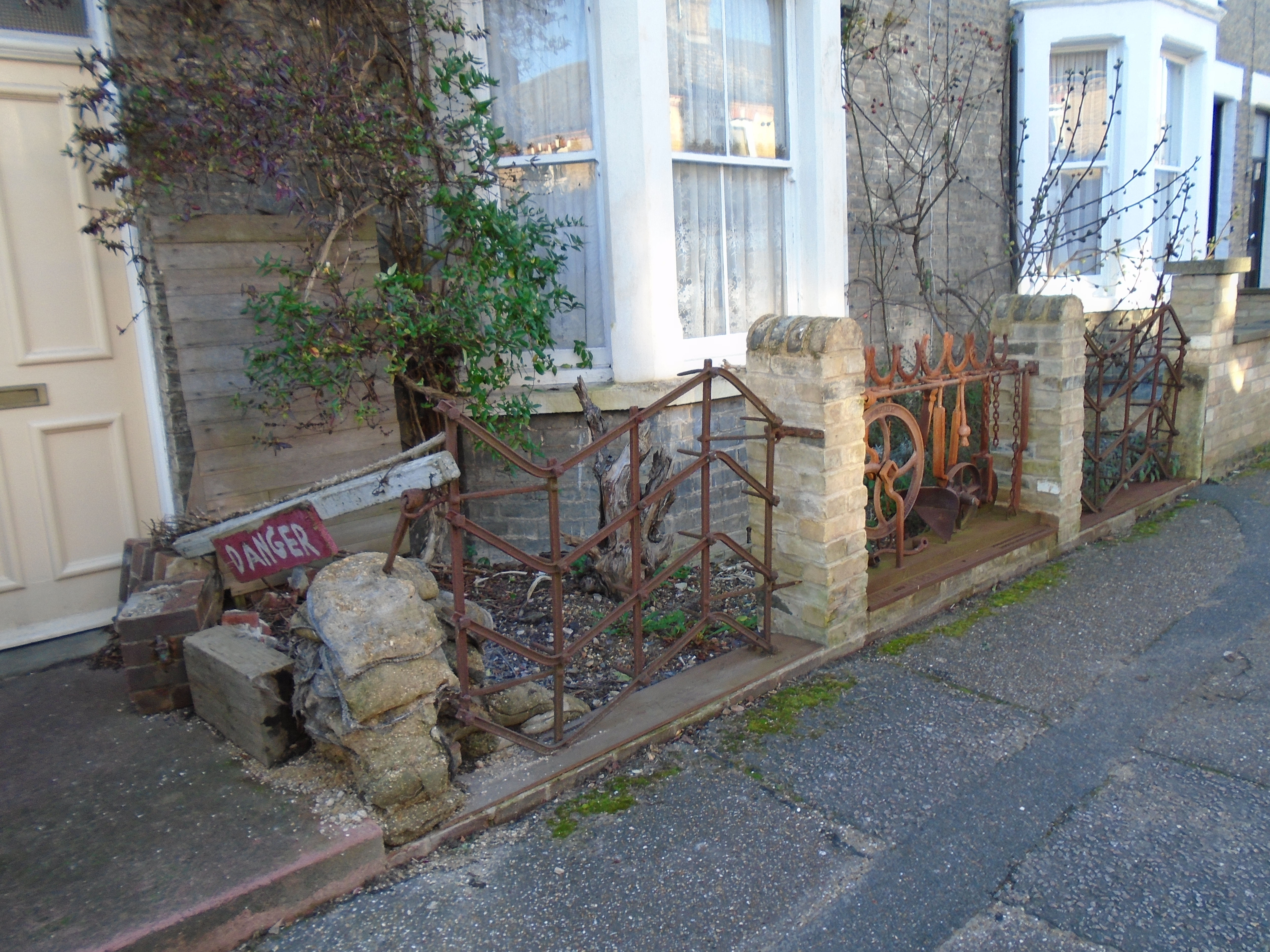 Megan Fitzoliver emailed me to say "You might like to head up Hertford St to see War and Peace, which is an installation of mine, the iron work part of which was created working with and at Taylors Foundry. The space behind the sculptural railings is part of the installation; a growing space to show the seasons and a herb garden (currently needing a replacement rosemary as it was hit by frost!) and more work on the sandbags (the original ones were made from coffee sacks to represent climate change). " and later "War and Peace was created in 2018 to mark the Centenary of WW1 ending. There s a lot of detail and meaning in every part, but two snippets: Athol was a Signaller, hence the morse code. The map in the base on the left section was his route through the Somme in 1918, in his handwriting (up to the date he took down the signal for peace). In the right hand base, amongst other things, there are 100 flowers of peace (poppies for GB, cornflowers for France, forget me nots for Germany).
