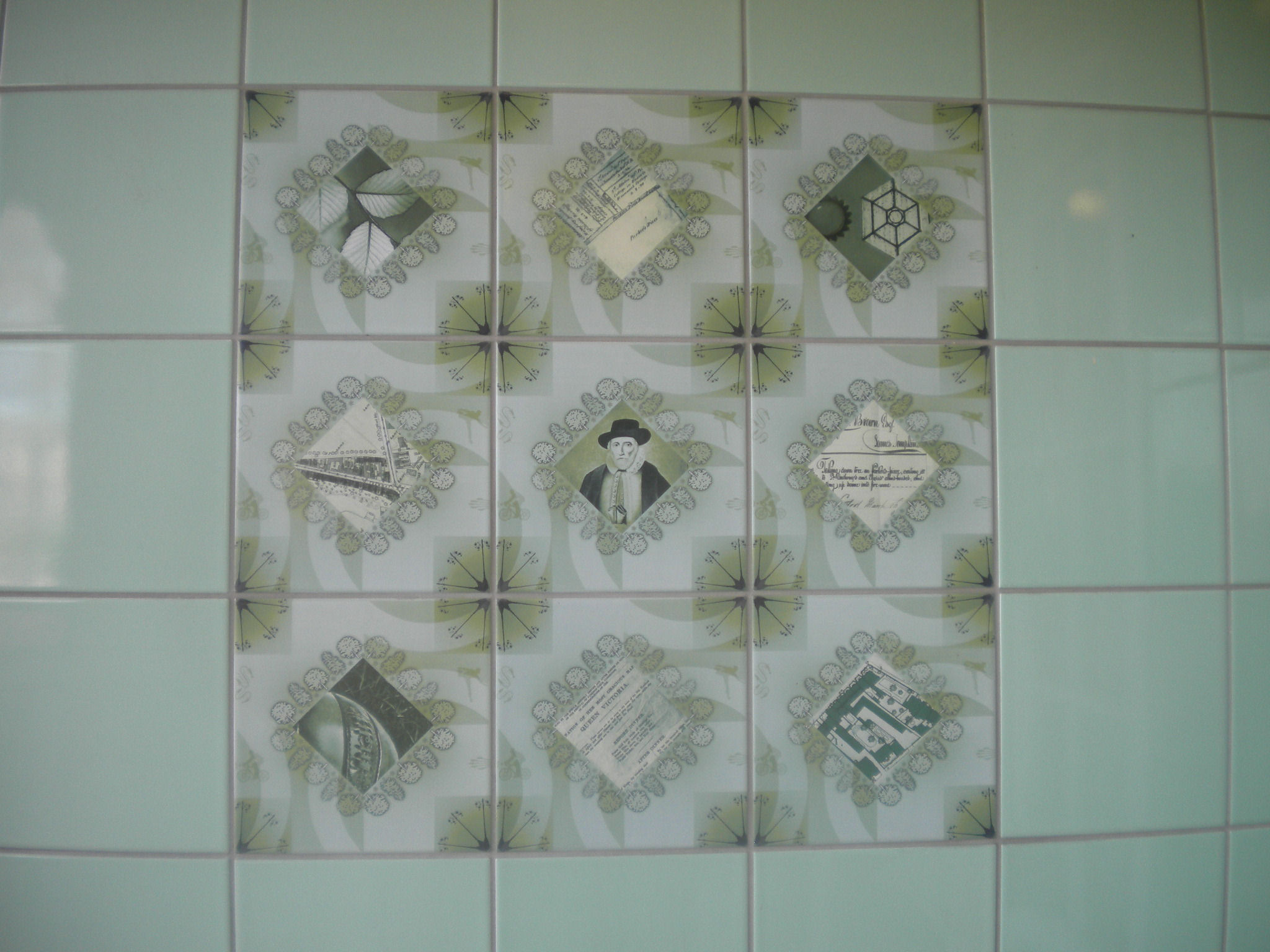 Adam and Eve, Adam and Eve StreetAdam and Eve Street is a residential street parallel to East Road. This mural is tucked away in the doorway of a modern development called Garden Court (built in 2007). It is by local artist Kate Klinck. The tree is the tree of knowledge and the birds represent Adam and Eve. Eve is the topmost one tempting Adam with the apple! |