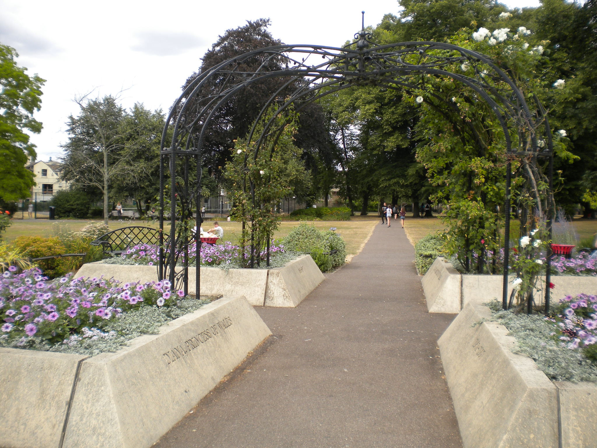 Christs Pieces is a park close to the centre. When Diana, Princess of Wales, died in 1997, the city council decided to make this rose garden as a memorial. A plaque says "Diana, Princess of Wales Rose Garden, opened by The Right Worshipful the Mayor of the City of Cambridge, Councillor Richard Smith JP on 22nd September 1999".