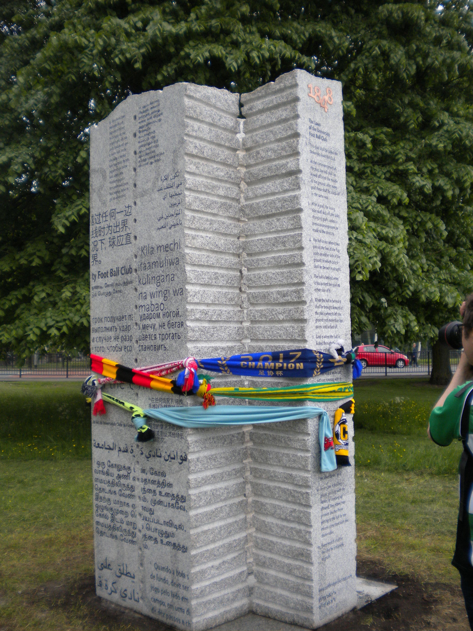 The artwork gives the rules in different languages, to show the international spread of football. It is teamed with Street Child United which uses sport to give a voice to street children. So this is only part of the artwork. Other parts are located around the world. The website of the sculpture is here.