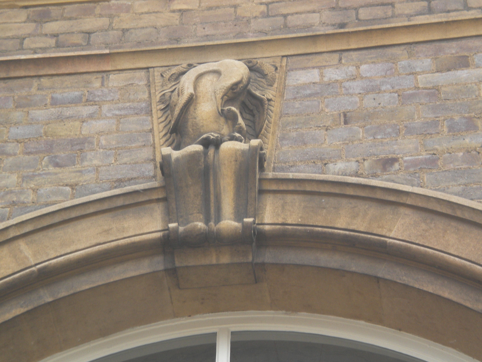 To see the art below, you need to go out of the Downing site and turn right, to see the outside of the Sedgwick Museum. The coat of arms of Cambridge University is supported by an iguanodon (on the left) and a giant sloth (on the right). Beyond is this mammoth