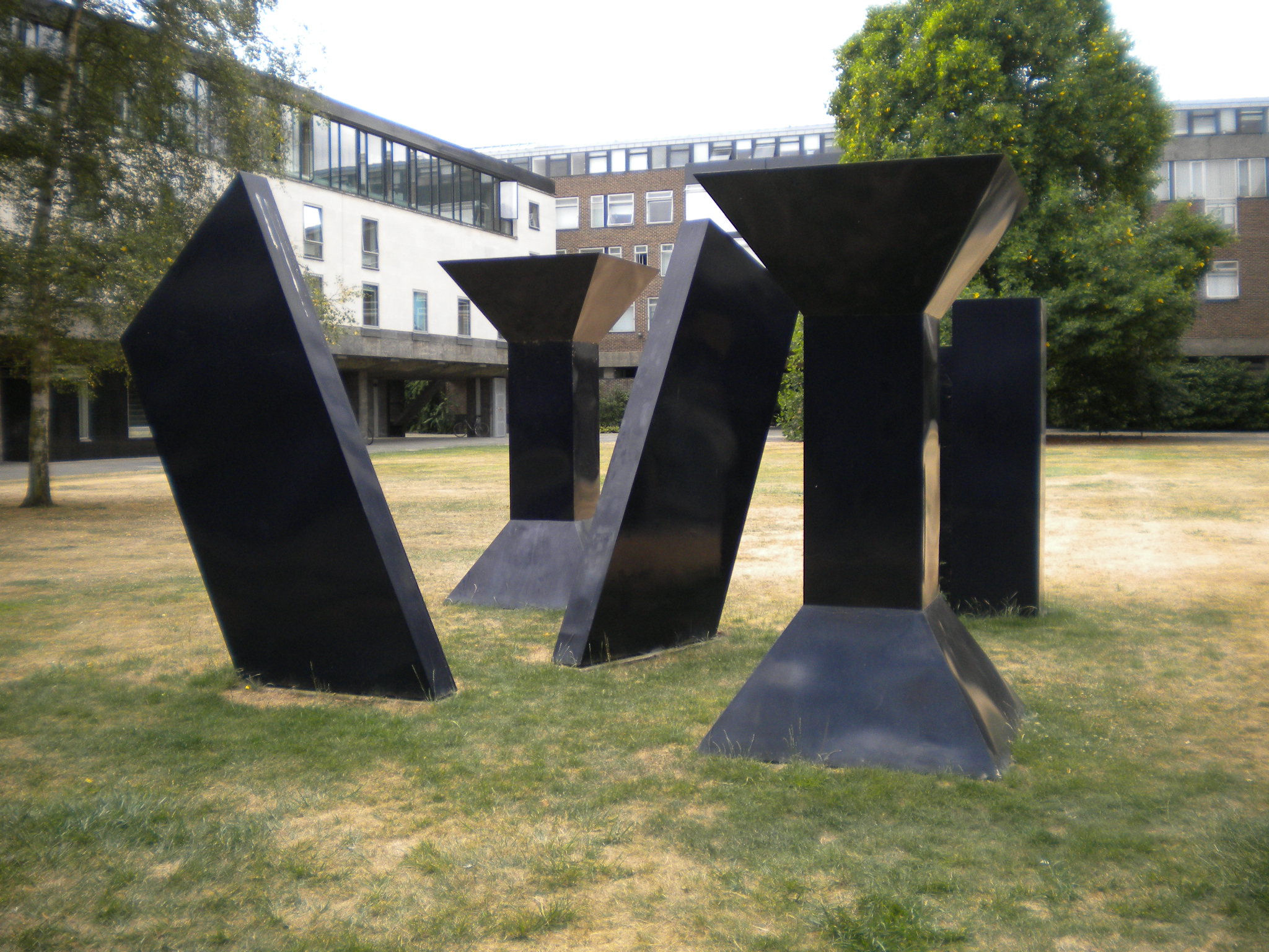 The Now, front of Churchill College, Storey's WayThe other sculpture in front of Churchill College is also by Nigel Hall. It is The Now, dated 1999. The college website describes it here. It says "By placing a wedge and a cone together in a position that individually would be impossible to sustain, Nigel Hall enables them to stand in mutual support." Murray Edward College is close to Churchill College, on the Huntingdon Road, and also has sculpture in its grounds. It has a notable collection of women's art inside the college, called the New Hall Art Collection, see here - again call in at the porter's lodge to see if you can visit. By the way, "New Hall" was the old name of Murray Edwards College, and the art collection didn't want to change the name - it's complicated... |