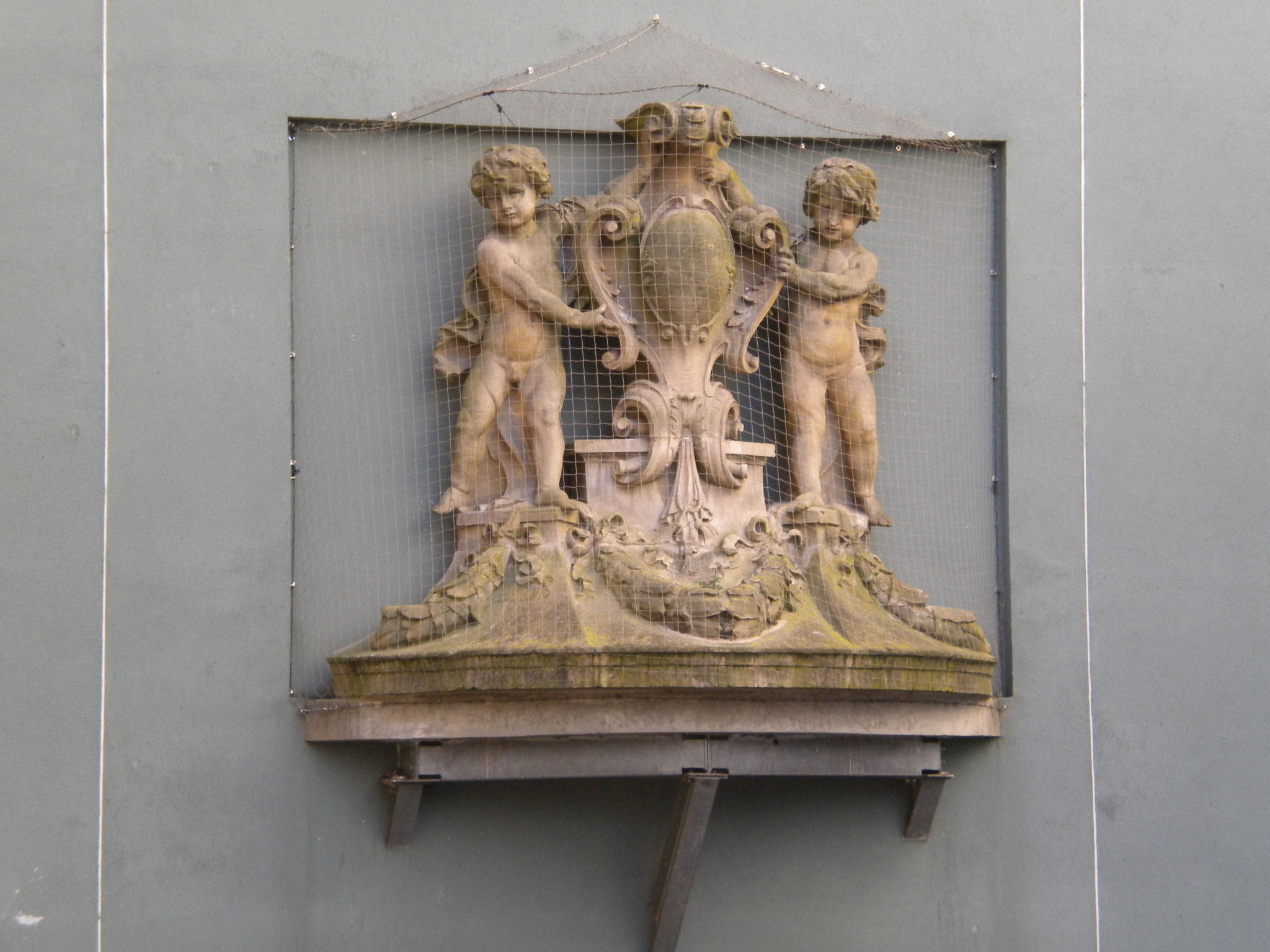 Tibbs Row artThis ornate coat of arms with two supporting cherubs was originally on the Edwardian Norwich Union building, on the corner of Downing Street and St Andrews St. It gets moved around the place as buildings get built, and subsequently demolished! This website says "Another attractive Edwardian building on this site was destroyed to build the hideous Norwich Union building on the Downing Street/St.Tibbs Row corner - they preserved the statue of cherubs from over the door and it sat somewhat incongruously over the new entrance. This building was in turn demolished to build the Grand Arcade." At present, it is at the end of Tibbs Row, a small road off Downing Street, at the back of John Lewis, above a carpark entrance. |